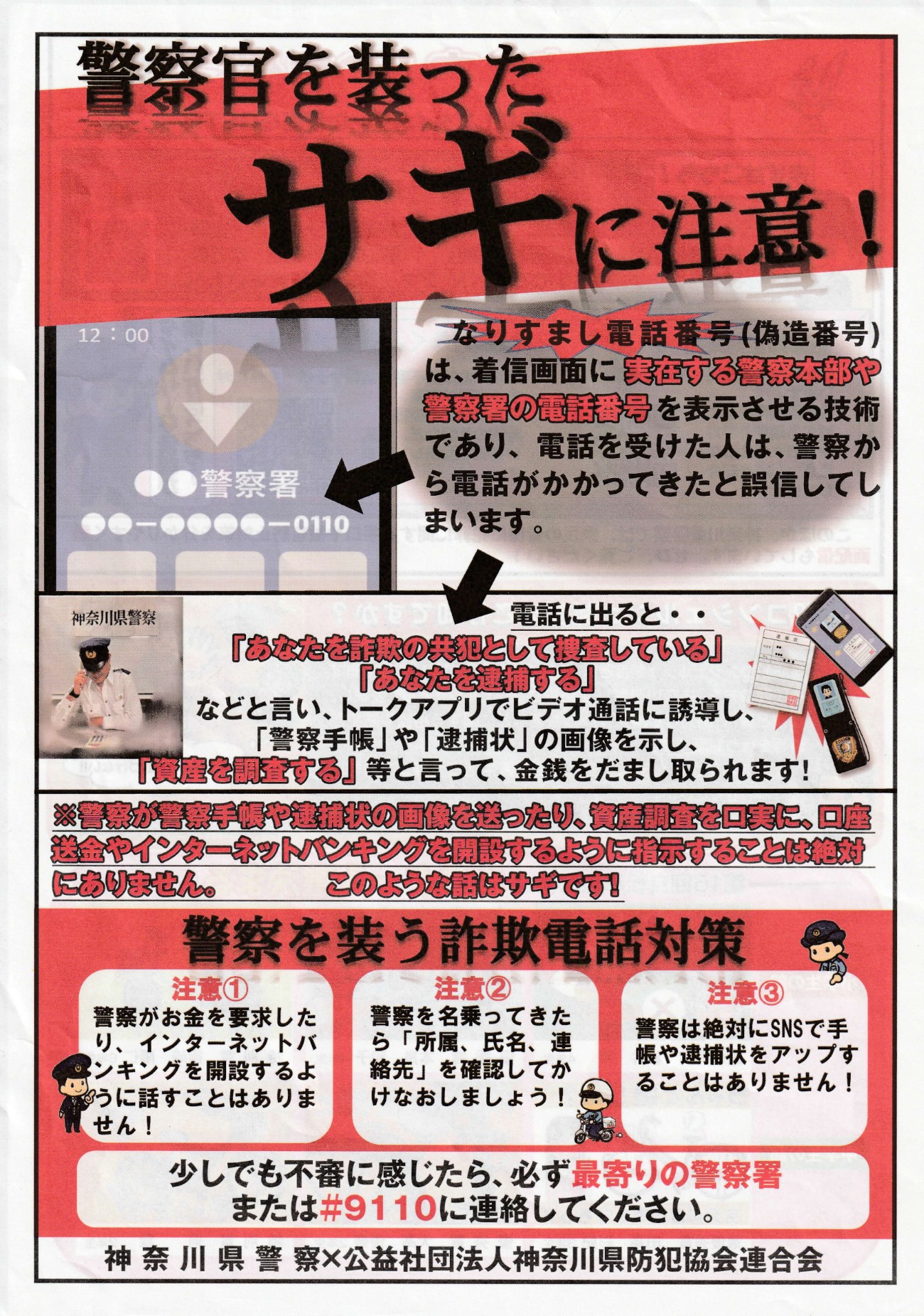 また、警察官を装った特殊詐欺も多く、右のチラシを配布いただきました。