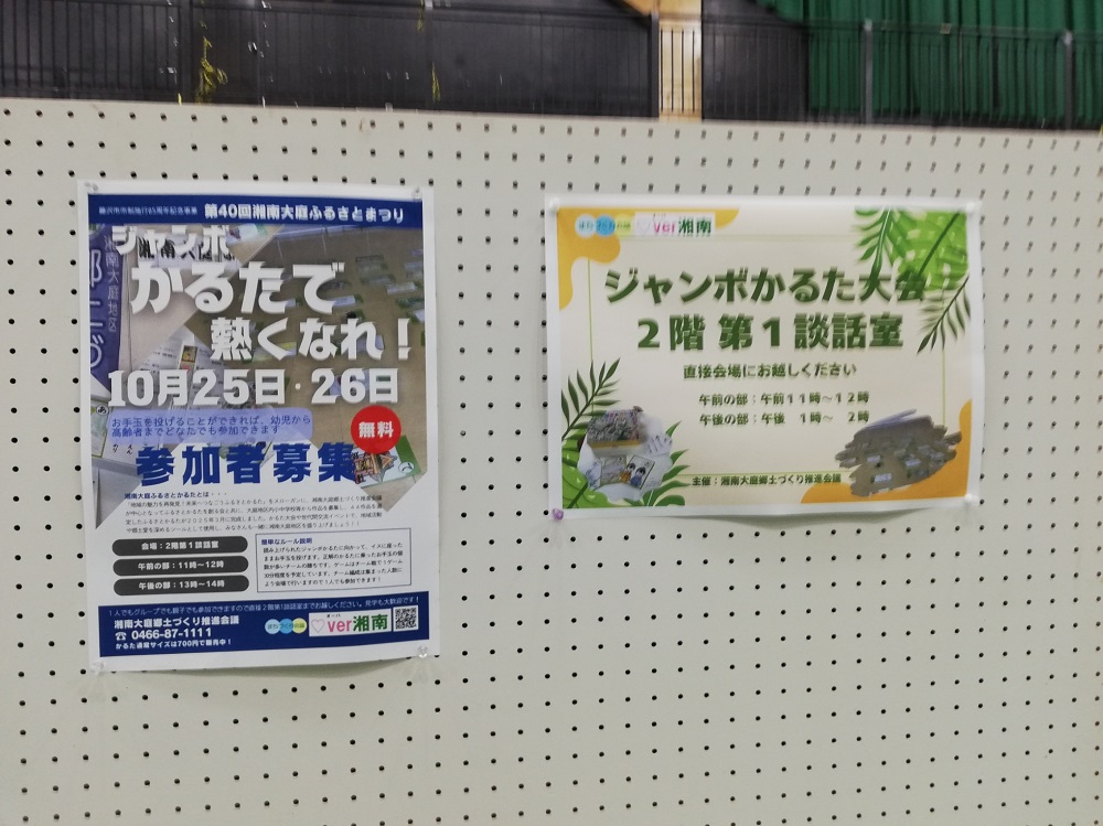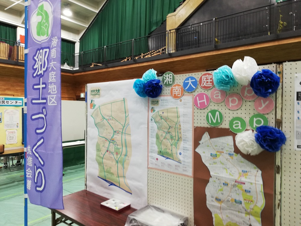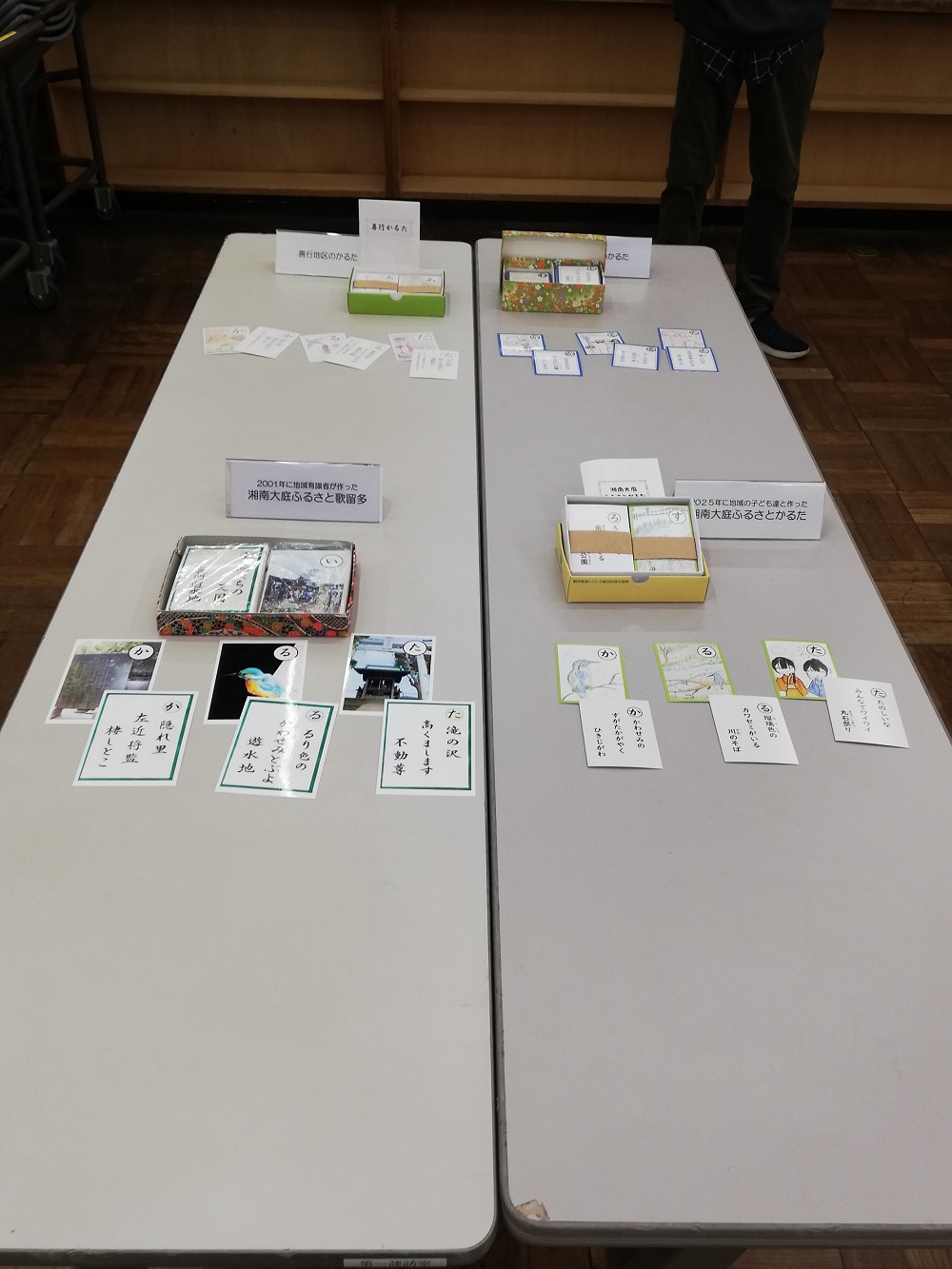 郷土づくり推進会議コミュニティ活性化部会(かるた部会)では、10月25日(土)・26日(日)の両日に開催された「湘大庭地区ふるさとまつり」にて、市民センター2階の談話室を会場として、「湘南大庭ふるさとかるた」の絵札サイズを大きくした「ジャンボかるた大会」を実施しました。 両日ともあいにくの悪天候ではありましたが、室内イベントはほぼ予定通り行われ、元気いっぱいの小学生とその保護者の皆さんが、読み手の読み札に対応するジャンボ絵札にお手玉を投げ、うまく札に乗った数で勝敗を競うゲームに大いに盛り上がり、来場者の皆様からもご好評をいただきました。 また、ゲーム会場に隣接して、通常サイズの湘南大庭ふるさとかるたや、善行・明治地区のかるた、2001年に地域の有識者が作成した湘南大庭ふるさと歌留多の展示を行いました。さらに、湘南大庭ふるさとかるたの完成が「広報ふじさわ」や「タウンニュース」に掲載された記事、藤沢西高校美術部が制作したかるた応募啓発ポスターも展示し、来場者の関心を集めるひとときとなりました。 他方、体育室の展示会場では、郷土づくり推進会議の各部会による活動資料を展示し、日頃の取り組み・成果を来場者の皆様に紹介しました。
