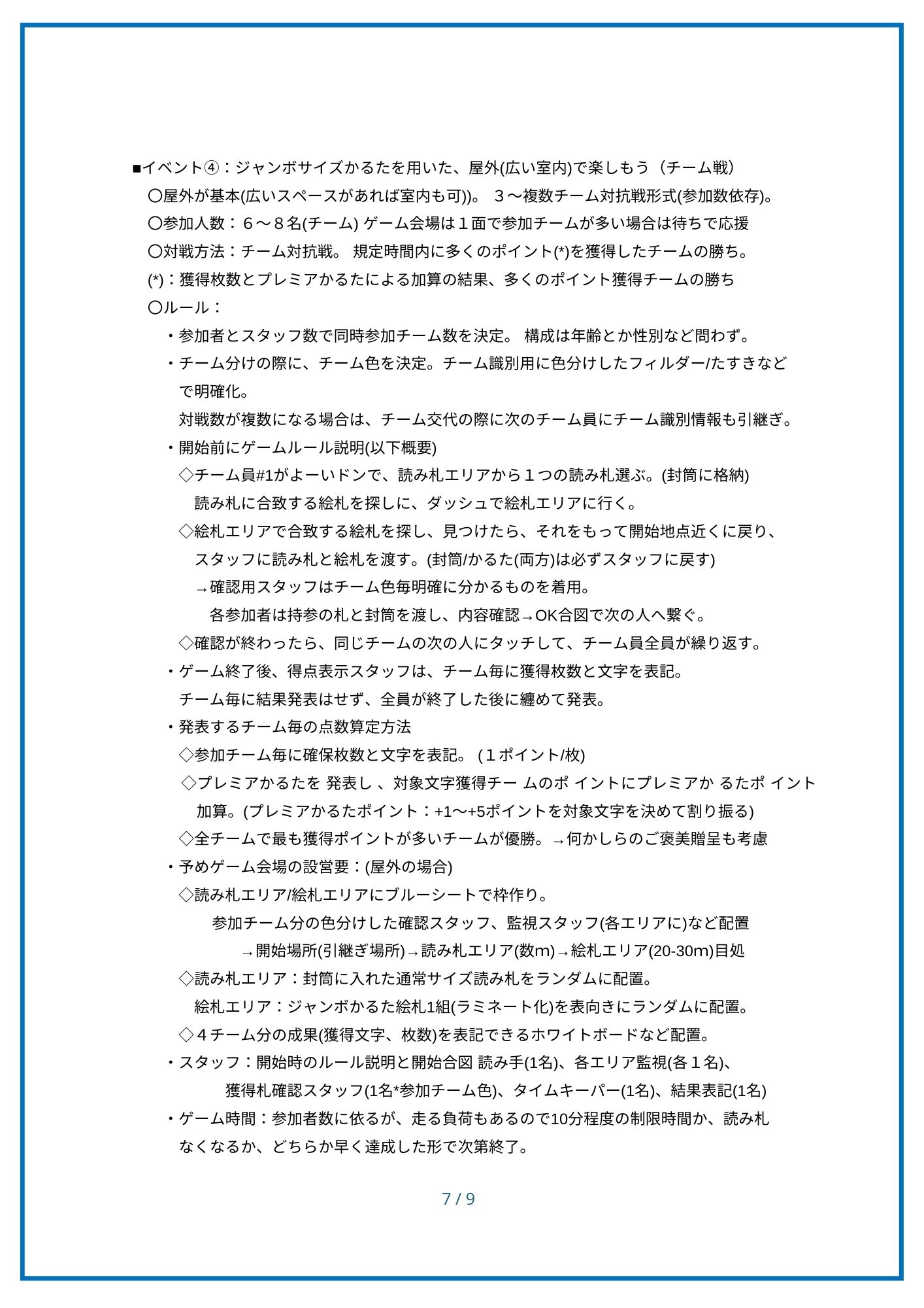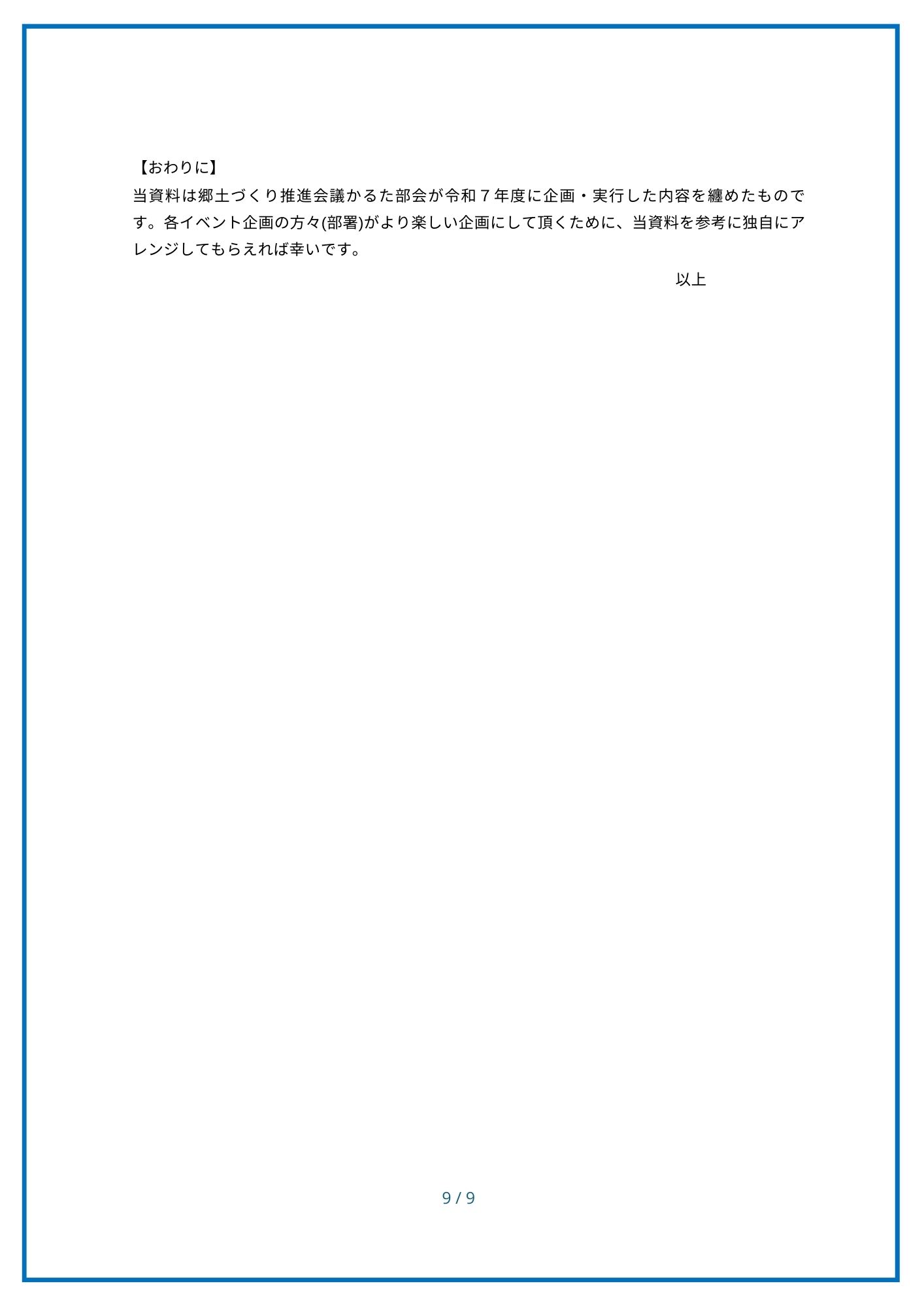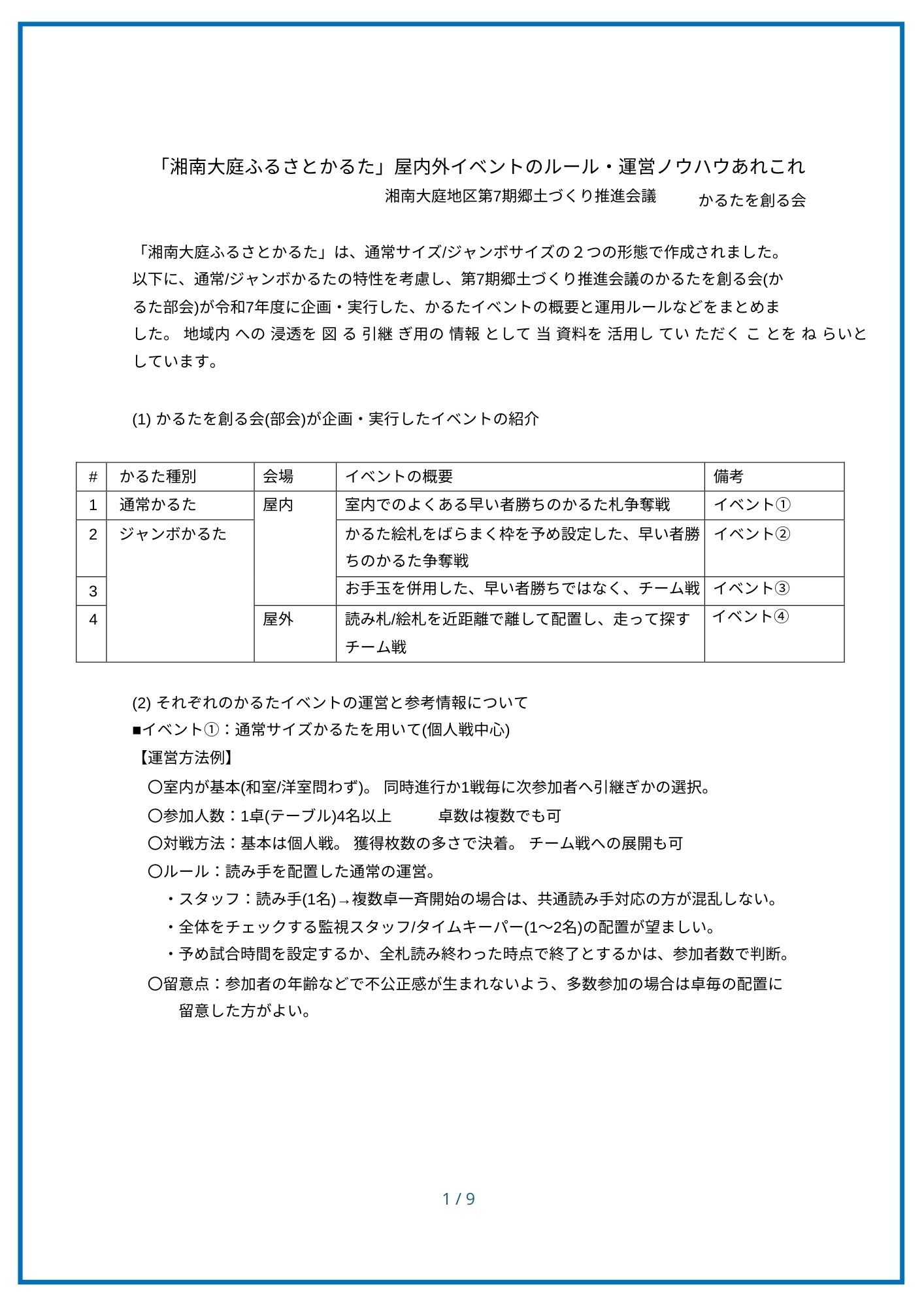 「湘南大庭ふるさとかるた」は、地域の小中高校の協力をもとに、第7期郷土づくり推進会議のかるたを創る会(かるた部会)が令和7年度に企画・制作した、地域密着の「みんなのかるた」です。かるたを使って、地域のみなさんが楽しめるよう、かるたイベントの概要と運用ルールなどをまとめました。 地域内への浸透を図り・次世代への引継ぎ用の情報として当資料を活用していただくことを願っています。