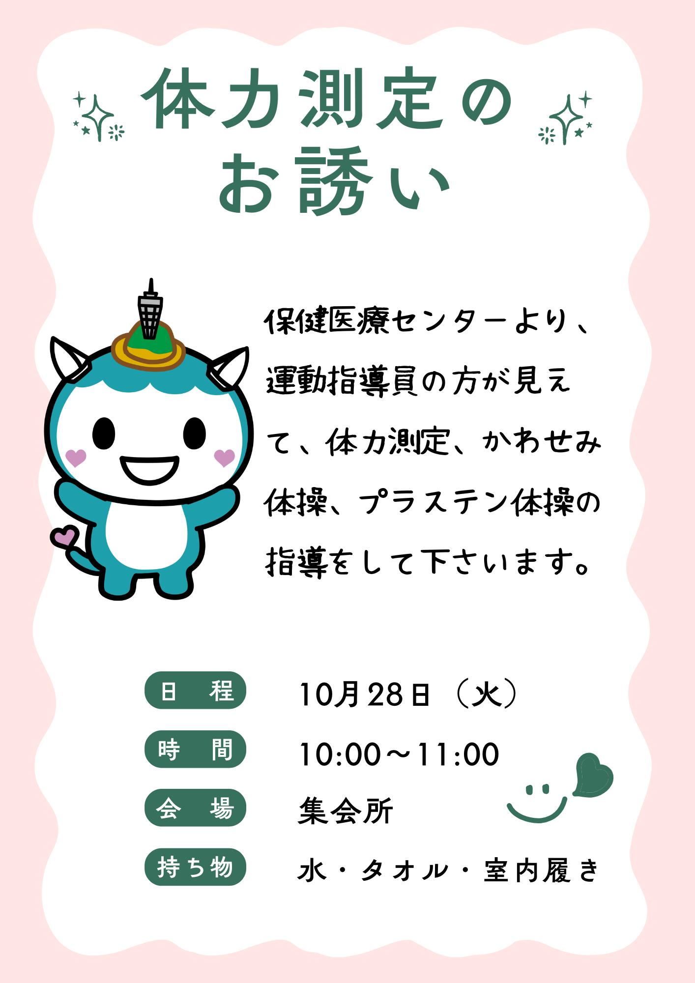 北保健医療センターより、運動指導員の方が見えて「プラステン体操」「かわせみ体操」体力測定を行いました。
