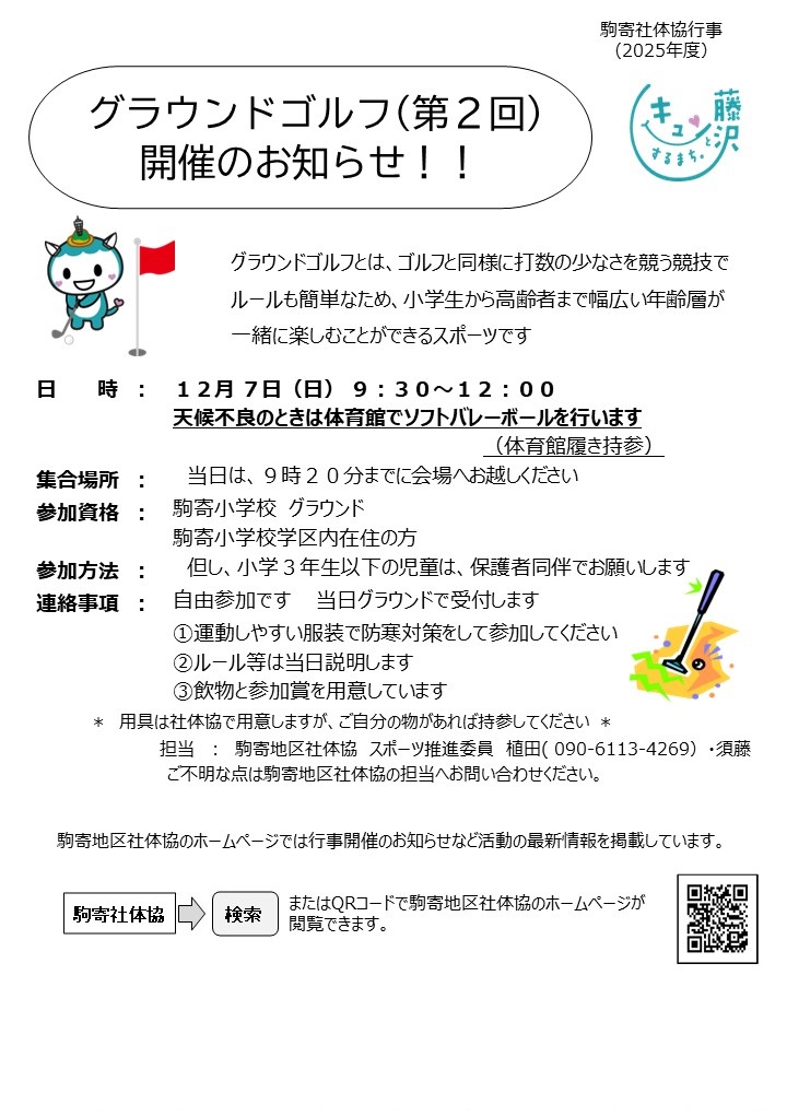 期日 : 2024年5月19日(日) 場所 : 駒寄小学校グラウンド 集合 時間 : 9時30分 ~ 12時(9時20分集合) 内容 : グラウンドゴルフ (雨天やグラウンドコンディションが悪い場合は体育館で室内ペタンクを実施 体育館履きを持参してください) 参加対象: 社体協担当…