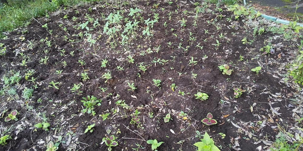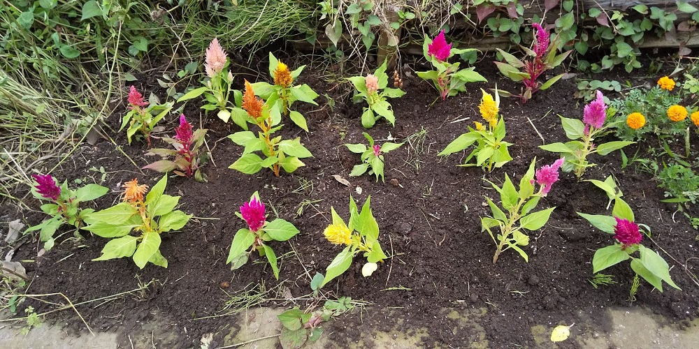 玄関前、中央はひまわり、外へ向かい、センニチコウ、