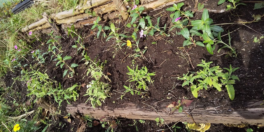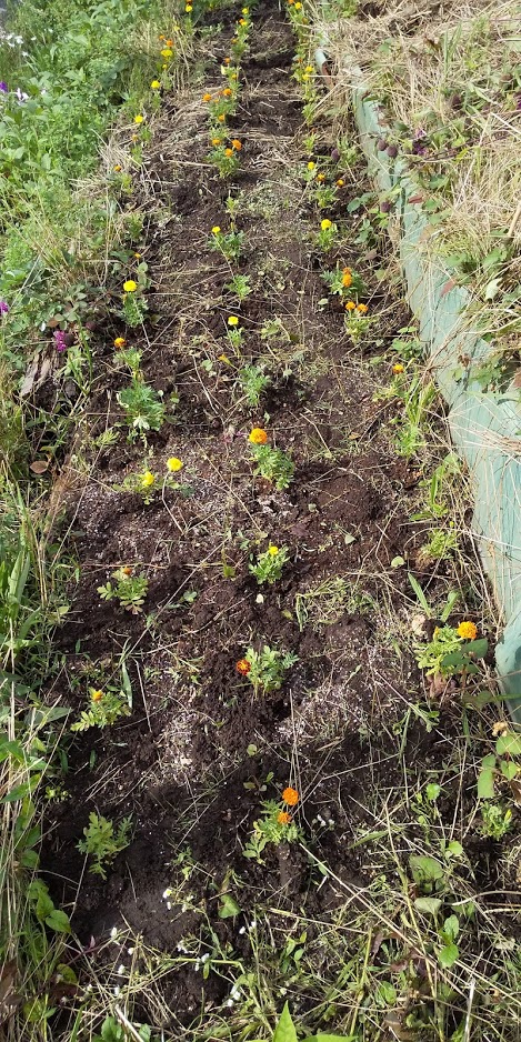 土手の中央右寄り、下から3段目にマリーゴールドを植えました
