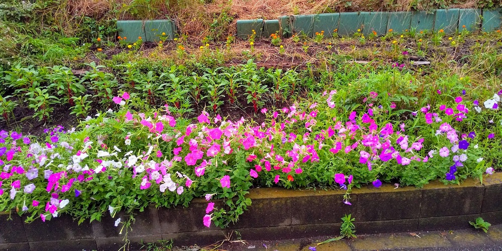 土手の中央右寄り、下から2段目にニチニチソウ(奥)