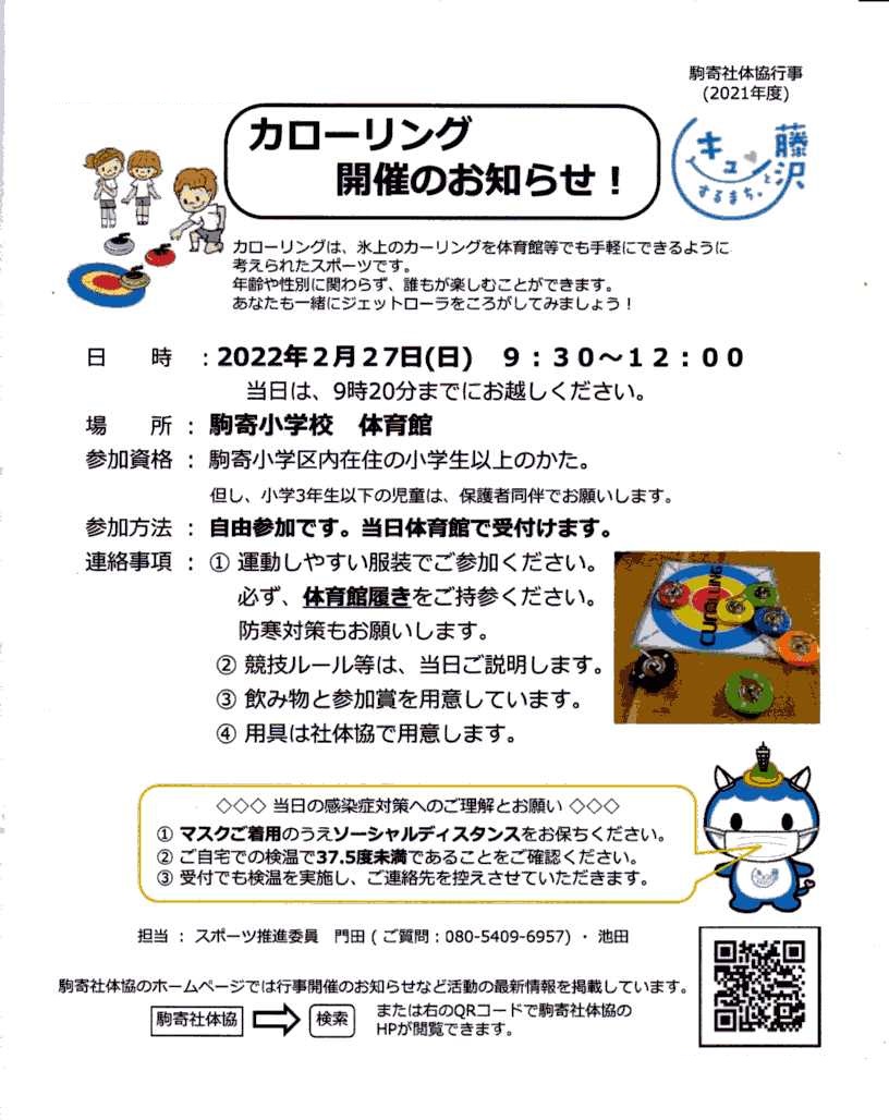お知らせ印刷2022/01/17 08:00 投稿者:ユーSカローリング開催のお知らせ2月27日(日)駒寄小学校 体育館で、カローリングを開催します 寒い時期ですので、防寒をしっかりして参加してください 体育館履きを必ずご持参ください ※ マスクの着用をお願いします また 体調のすぐれない場合は参加を見送ってください なお、新型コロナウイルス感染の状況によっては、中止になることもありますので、ご理解とご協力をお願いいたします (中止になる場合には、このサイトにてお知らせいたします) 駒寄地区社会体育振興協議会へ戻る