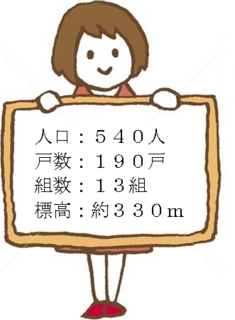 南西二区は西小林地区の南東部に位置し、標高はおよそ330m、面積約4.010㎢、人口およそ540名、戸数190戸、組数13組で構成される田園風景豊かな農村地帯です。地域には豊富な湧水が二か所あり、麓の田畑の農産物を潤しています。名所としては、西大出水(にしおいでみず)の太鼓橋、巣ノ浦の天神、大出水の泉姫の墓、湧水池、芹川池の蛍などがあります。