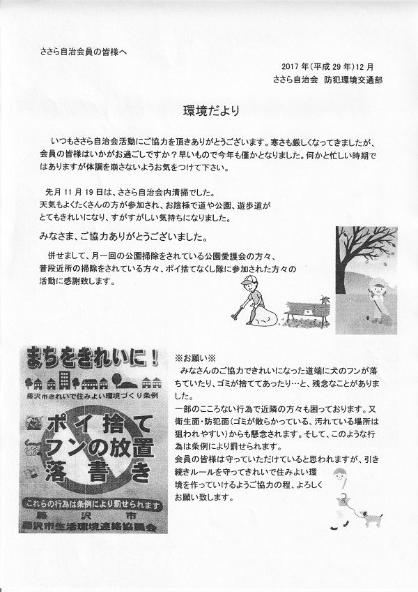 回覧・配布印刷2017/12/24 10:33 投稿者:ささら自治会【回覧・環境部】環境だよりいつもささら自治会の環境活動にご協力頂きありがとうございます。 環境部より、日ごろの活動報告、及び、お願いを回覧致します。 藤沢市 ささら自治会へ戻る