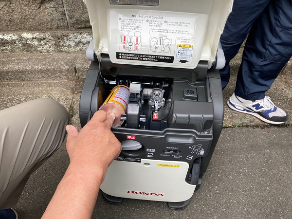 カセットガスボンベ2本をセットして、レバーを引いて始動です。