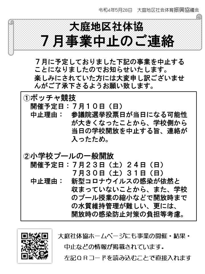 イベントのお知らせ印刷2022/06/13 22:28 投稿者:takezaki7月の社体協イベント中止のご連絡7月に予定していました社体協イベント(ボッチャ、プール開放)は、 諸事情により中止となりましたのでお知らせいたします。 藤沢市 大庭地区社会体育振興協議会【大庭社体協】へ戻る