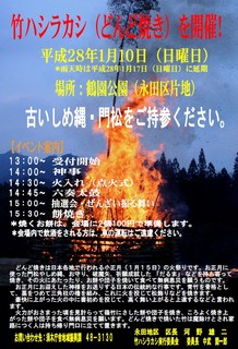 活動記録印刷2016/01/11 14:38 投稿者:永田区【小林市】【第3回竹ハシラカシ】平成28年1月10日(日)、永田地区鶴園公園にて、第3回竹ハシラカシが開催されました。この行事は永田地区役員を中心に竹ハシラカシ実行委員会を結成し、各小組合長の皆さんと協力して、昨年から竹を切ったりやぐらを組んだりと準備を進めてきました。 この日は、心配された天候も穏やかとなり須木地区住民約300人が会場に訪れ、盛大に祭りが開催されました。高く燃え上がる火に無病息災と五穀豊穣及び今年1年の幸せを祈願しました。 永田区【小林市】へ戻る