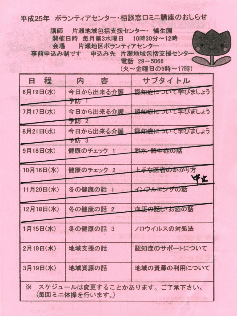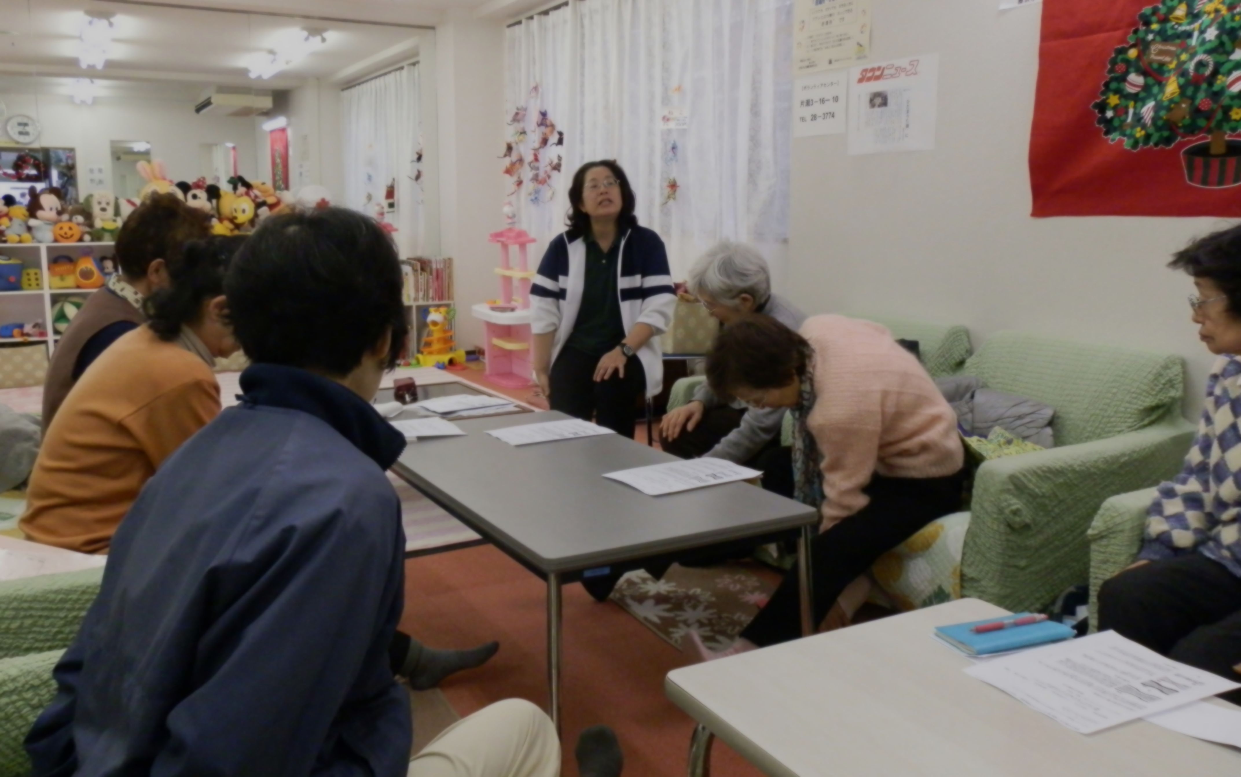 ブログ印刷2013/12/18 20:48 投稿者:ボラセン01相談窓口ミニ講座のひとコマ12月18日(水)10時半~12時、月例の相談窓口ミニ講座が開催されました。6人の参加、寂しかったのは寒かったせい?講師は地域包括支援センターの超ベテラン支援員。テーマは「血圧の話・お酒の話」。写真は、休憩中のストレッチ。最後は、一番美味しいお酒の飲み方は?あれこれもりあがりました。来年も続けますよ。 片瀬地区ボランティアセンターへ戻る