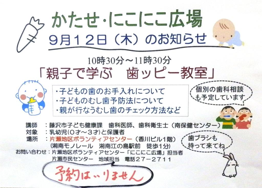 ブログ印刷2013/09/06 08:00 投稿者:ボラセン01むし歯はないかな?手入れしてる?9月12日(木)のにこにこ広場、歯の手入れ、むし歯予防、むし歯のチェックなど歯科の専門の方から教えていただきます。予約不要です。(歯ブラシの持参をお願いします) 片瀬地区ボランティアセンターへ戻る