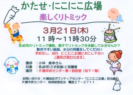 ブログ印刷2013/03/08 10:00 投稿者:ボラセン01にこにこ広場の「楽しくリトミック」「かたせ・にこにこ広場」では、「楽しくリトミック」を行います。日時 3月21日(木)11時~11時半場所 片瀬市民センターの第1談話室(地下)。2歳前後の乳幼児とご家族の皆様どうぞ遠慮なく、おいでください。気持ちよい、汗(?)をながしませんか。(今年度最後の企画となります。さて、ボランティアセンターの年度とは?4月から翌年3月までがサイクルとなっています) 片瀬地区ボランティアセンターへ戻る