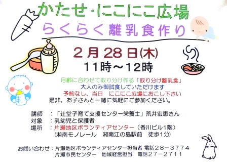 ブログ印刷2013/01/22 10:00 投稿者:ボラセン01らくらく離乳食作り―2月28日のにこにこ広場2月28日(木)の片瀬・にこにこ広場、離乳食のお話と試食(大人のみ)です。毎年ご好評をいただいています。事前申込不要、おこさまとご一緒にぜひおでかけください。 片瀬地区ボランティアセンターへ戻る