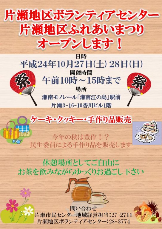 ブログ印刷2012/10/25 08:30 投稿者:ボラセン01(再掲)10月27日(土)、28日(日)は片瀬地区ふれあいまつり第35回片瀬地区ふれあいまつりが、10月27日(土)、28日(日)開催されます。場所は、片瀬公民館、しおさいセンター、そしてボランティアセンター。ボランティアセンターは、土、日ですが、オープンします。手作り品やケーキ、クッキーの販売をします。室内では、にこにこ広場の一年間の様子が分かる写真展も。どうぞお茶を飲みながらゆっくりとお過ごしください。(10月8日ポスター追加) 片瀬地区ボランティアセンターへ戻る