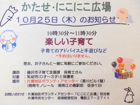ブログ印刷2012/10/11 08:30 投稿者:ボラセン0110月の片瀬にこにこ広場は「楽しい子育て」10月25日(木)の片瀬にこにこ広場は「楽しい子育て」。専門家によるアドバイス、手遊びなどお楽しみください。 片瀬地区ボランティアセンターへ戻る