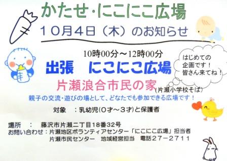 ブログ印刷2012/09/14 09:00 投稿者:ボラセン0110月の「出張にこにこひろば in Namiai」のお知らせ10月の「出張にこにこひろば、片瀬浪合」をお知らせします。10月4日(木)10時より、片瀬浪合市民の家で開催します。片瀬小学校横、正確には泉蔵寺の横です。お近くの方はどうぞ遠慮なくおいでください。 片瀬地区ボランティアセンターへ戻る