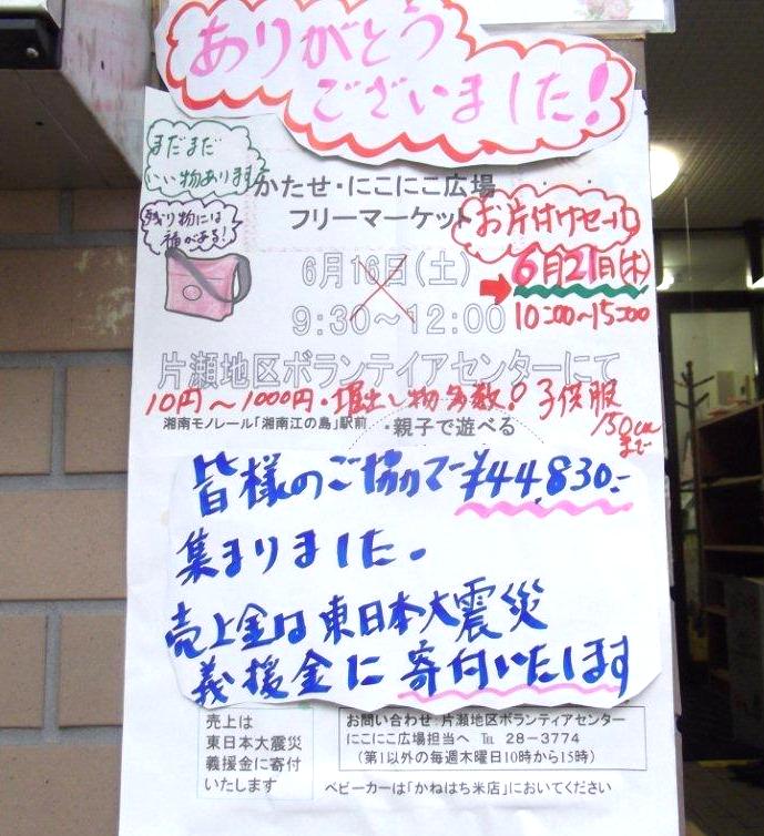 ブログ印刷2012/06/21 08:30 投稿者:ボラセン01フリーマーケットの御礼6月18日(土)、ボランティアセンターでフリーマーケットを開催しました。多数の方々のご利用、ほんとうに有難うございました。 本当に多くの方のご協力をいただきました。東北の被災地支援に役立ててまいります。 片瀬地区ボランティアセンターへ戻る