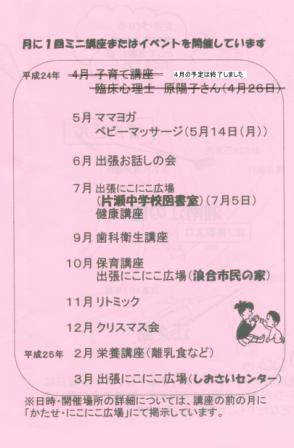 ブログ印刷2012/05/07 08:15 投稿者:ボラセン01片瀬にこにこ広場、年間の予定をお知らせします。片瀬にこにこ広場の月例イベントは、こそだてをはじめられたご家族の皆さんから 大変ご好評をいただいております。本年度のイベントの予定は以下のとうりです。新しい試みとして、出張にこにこ広場もおこないます。7月 片瀬中学校図書館10月 浪合市民の家2013年3月 しおさいセンター会場を移動しますので、ご注意をお願いします。 片瀬地区ボランティアセンターへ戻る