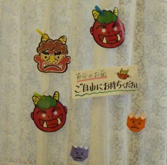 ブログ印刷2012/01/30 17:35 投稿者:ボラセン01もうすぐ節分片瀬の居場所「ひだまり」カーテンに、鬼の面がつけてありました。このお面、欲しい人はどうぞお持ち帰りを!でもお子さんからは手が出ませんね。鬼って昔の話かしら? 片瀬地区ボランティアセンターへ戻る
