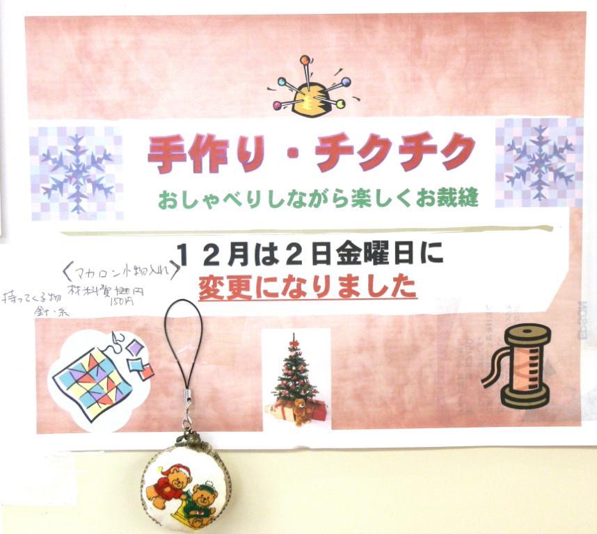 ブログ印刷2011/11/26 09:25 投稿者:ボラセン0112月のちくちくは、2日(金)に変更します。毎月第2金曜日に行っている「ちくちく」は、今月に限り、第1金曜日の12月2日(金)に変更します。 片瀬地区ボランティアセンターへ戻る