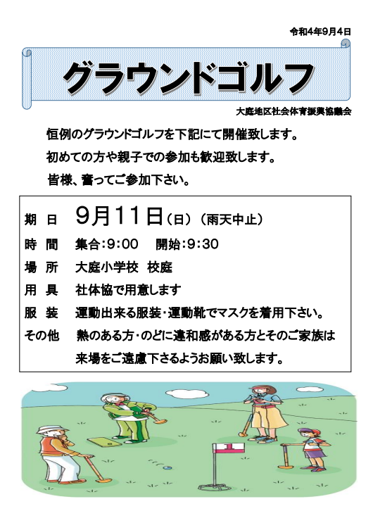 イベントのお知らせ印刷2022/09/04 17:36 投稿者:takezaki9/11(日)「グラウンドゴルフ」開催のお知らせ 9/11(日)9:00より大庭小学校にて恒例のグラウンドゴルフを開催いたします。 いつもお越しいただいている方々はもちろんのこと、初めてのご参加、お子様のご参加もお待ちしております。 (雨天時は中止となります) 藤沢市 大庭地区社会体育振興協議会【大庭社体協】へ戻る