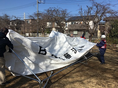 安否確認後、消火訓練を行いましたが、その前に工作班の方々が、テント設営訓練を行いました。前回も行ったのですが、前回は天候が悪かったので、骨組みだけでしたが、今回は暗幕も張りました。