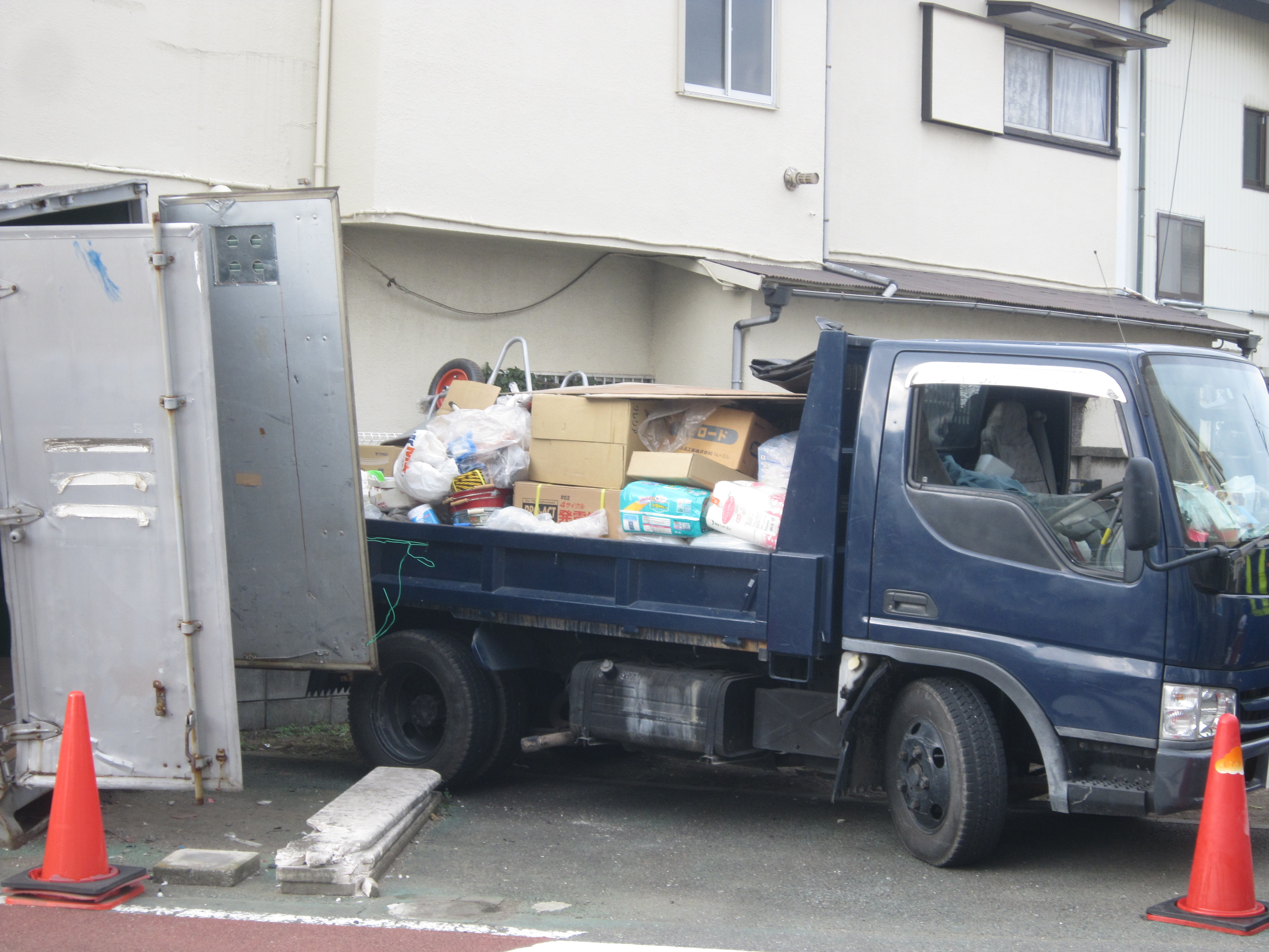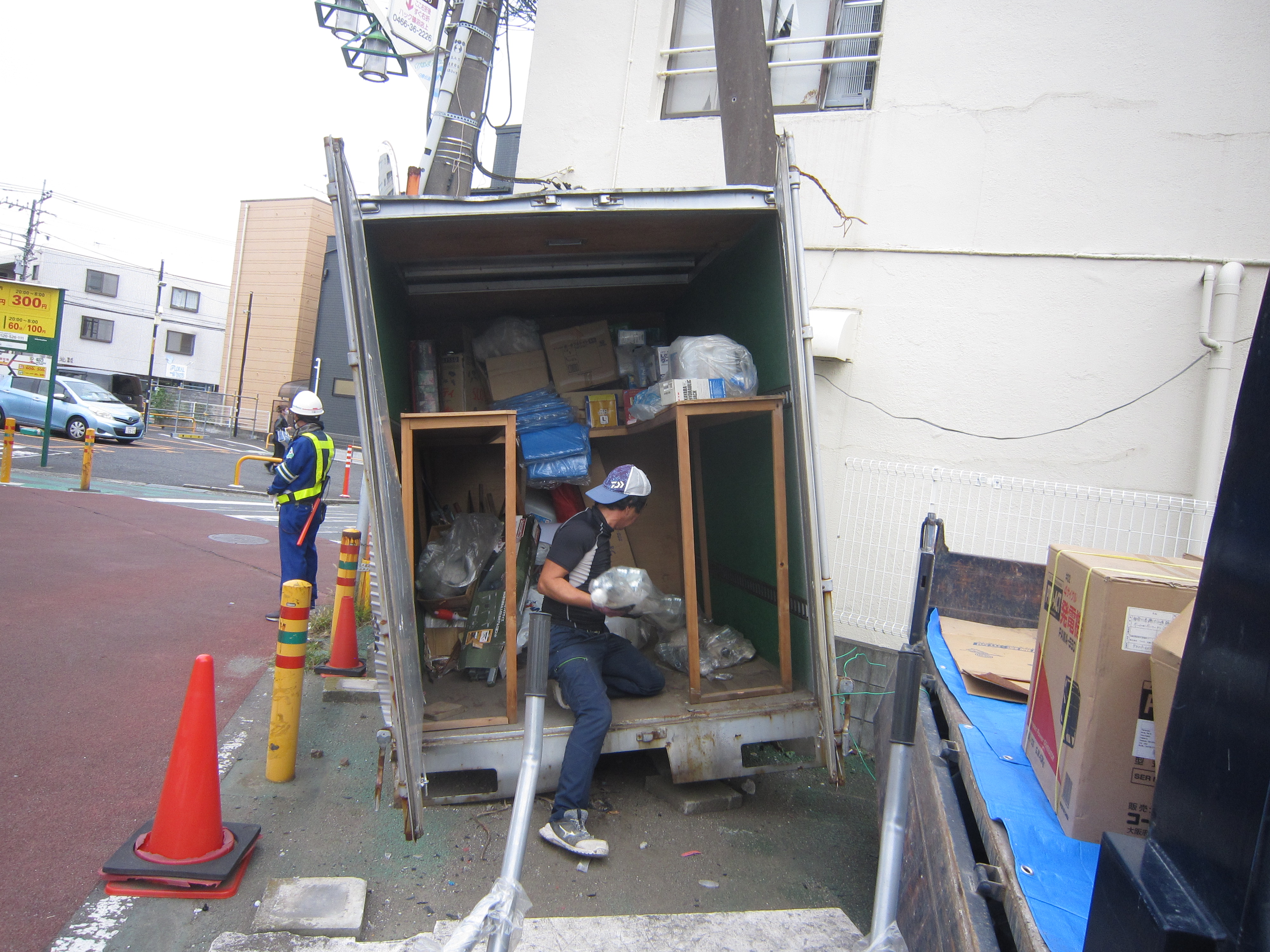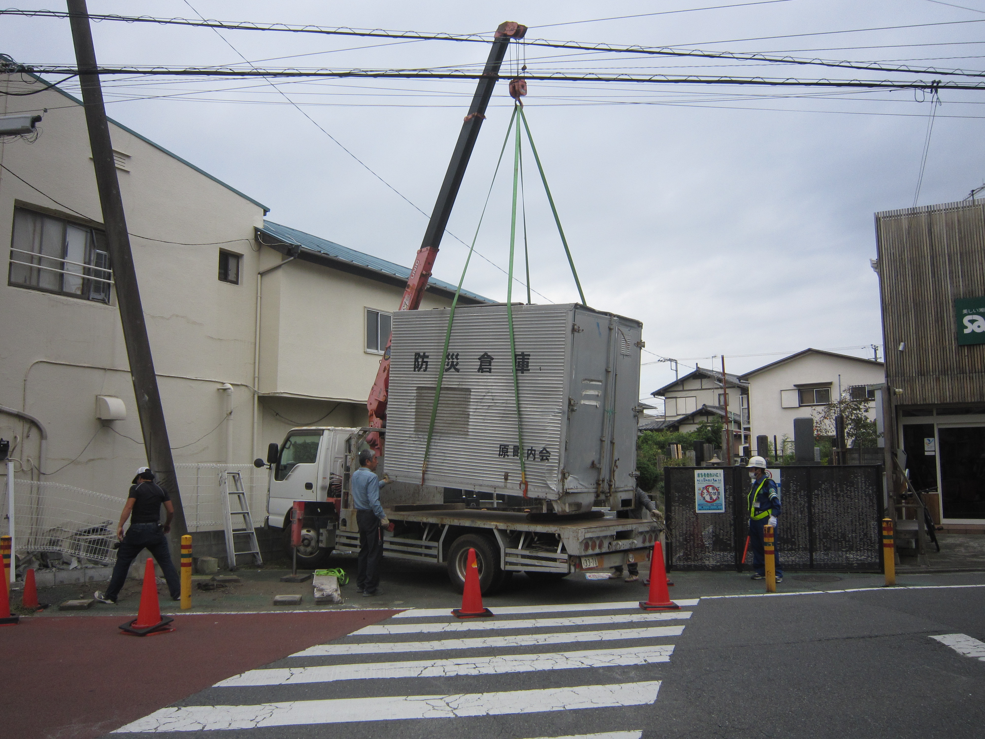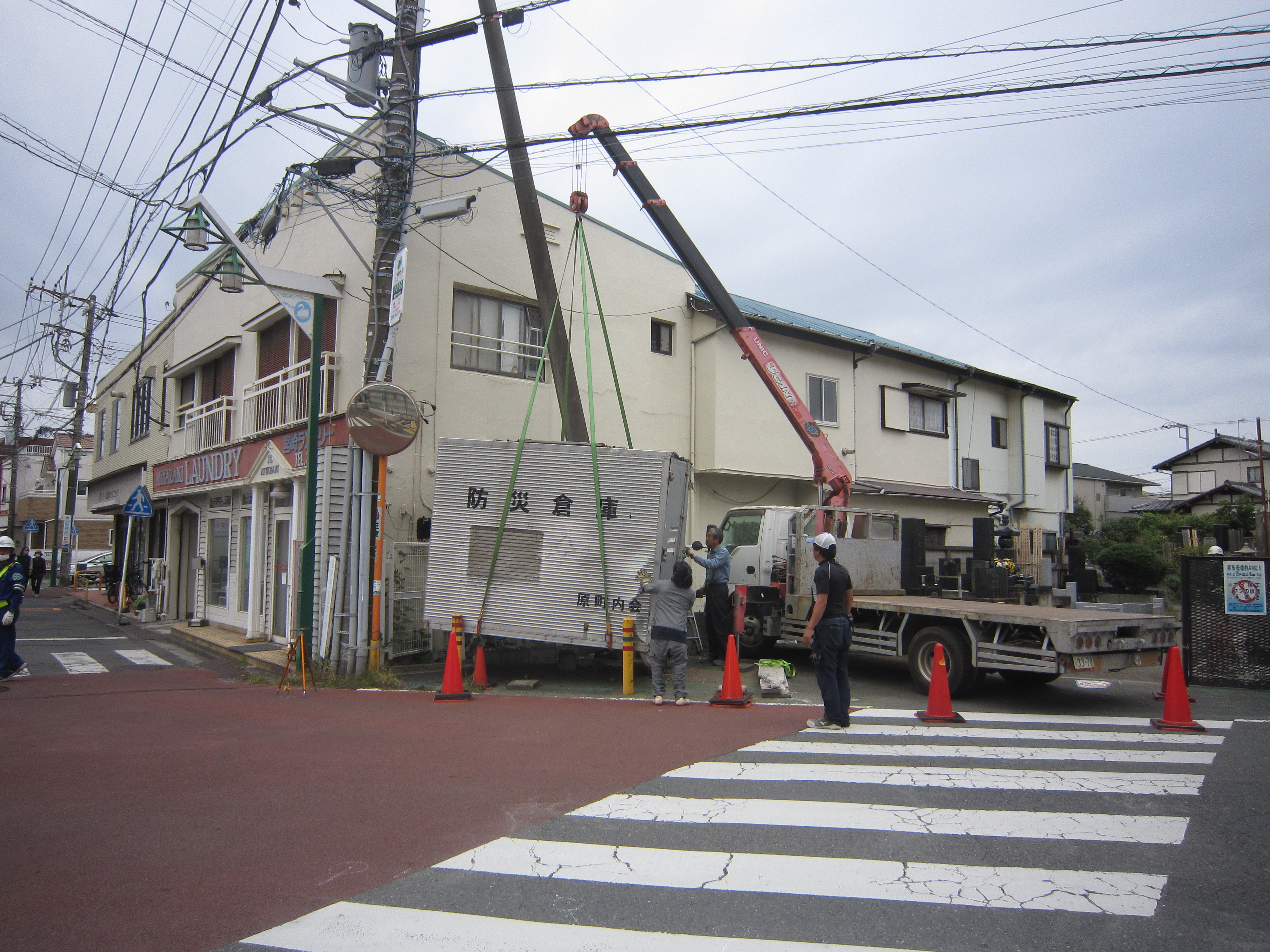 10月31日(火)8時30分から車に突っ込まれ破損された防災倉庫を撤去搬出しました。