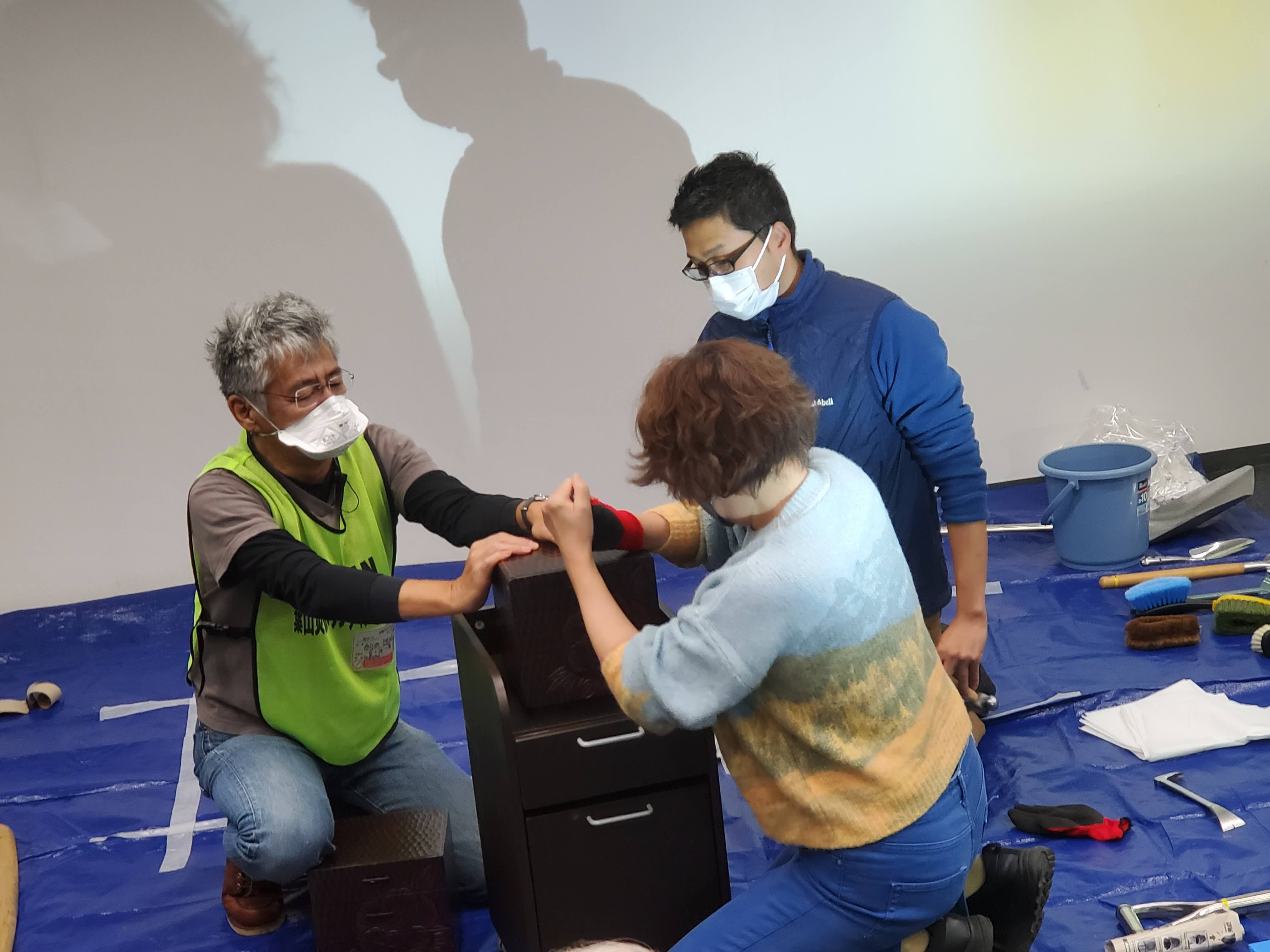 今回とり挙げた事例は<水害・清掃>で、前半は座学で①被災状況を知る②作業工程を知る③資機材を知る④ボランティアを知る⑤被災者を知るを学び、後半は6班に分かれてワークショップ「作業の見立て」を行いました。結果はバラつきがあったものの各班熱心な話し合いを経て必要人数・資機材を割り出すことができました。もとより正解と言えるものはない訓練ですが、工程と道具を知ることで計画をどのような順番と内容で考えたら良いのかの基準が得られた訓練でした。参加者の皆さん、講師の遠藤さん、社協職員の皆さんのご協力を感謝いたします。