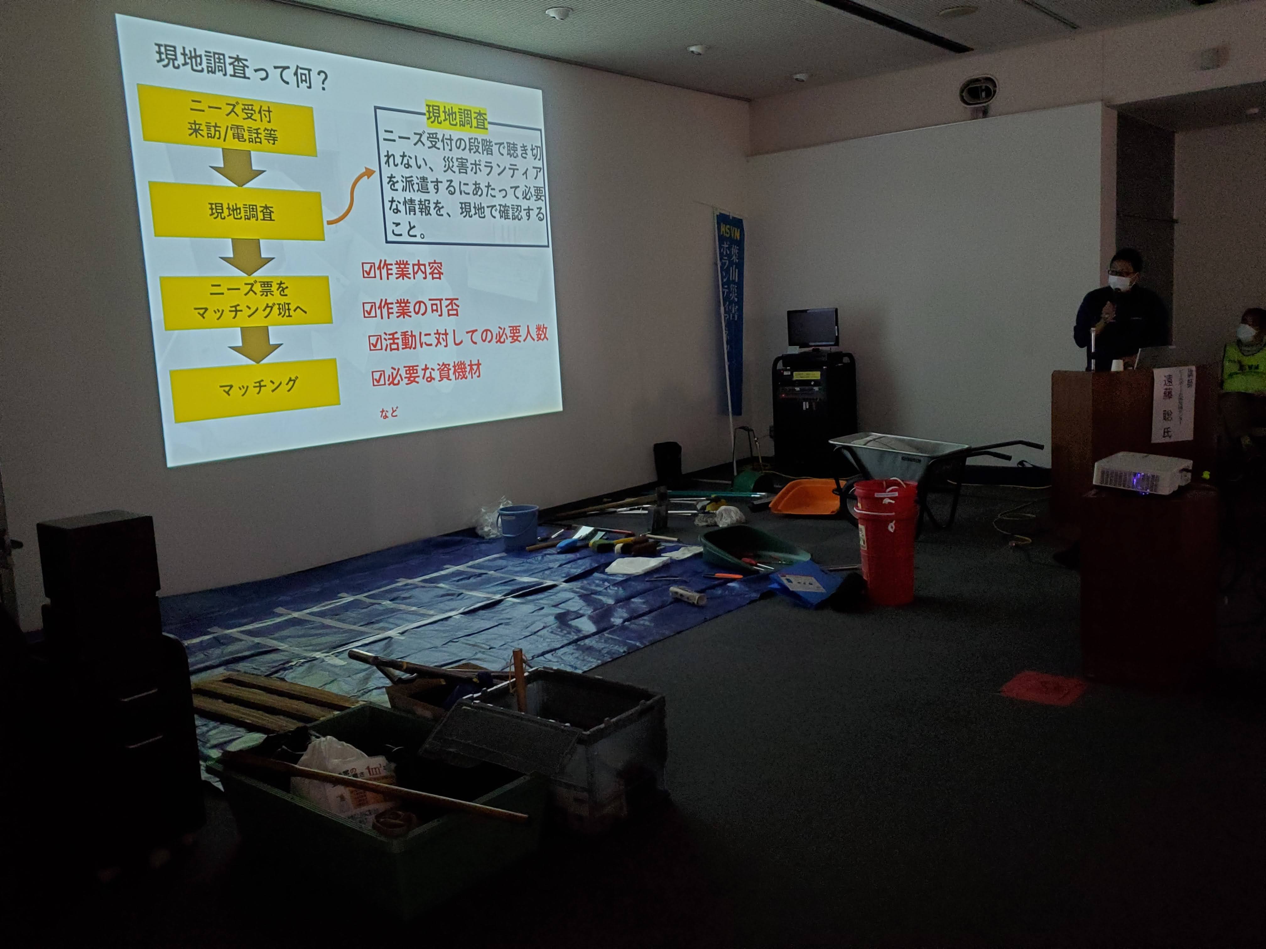 過去に行った<ニーズ調査>訓練でも、「この現場には何人のボランティアを派遣するのが良いのか?どんな資機材を用意すると良いのか?を判断するのがとても難しい」という声が上がっていました。葉山では寄せられたニーズに対しては原則すべて現地調査を行った上で、ボランティア派遣をマッチングすることにしていますので、必要人員×日数、準備する資機材の見立てが現地調査の大事なポイントになってくることから、今回の訓練を行うこととしました。