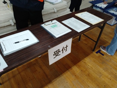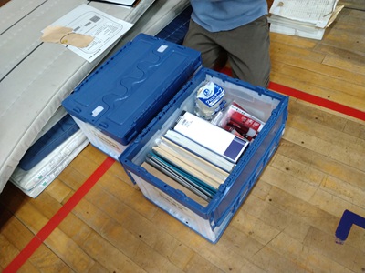 受付設置では、防災倉庫から、セットの箱を持ってきて、用紙を広げて受付体制を確認しました。