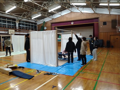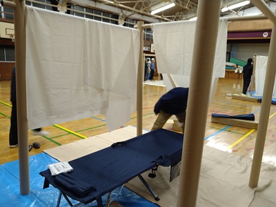 体育館に、ブルーシートを広げて、ゴザと毛布をセットして、段ボールのポールを組み立てて間仕切りをセットする訓練でした。