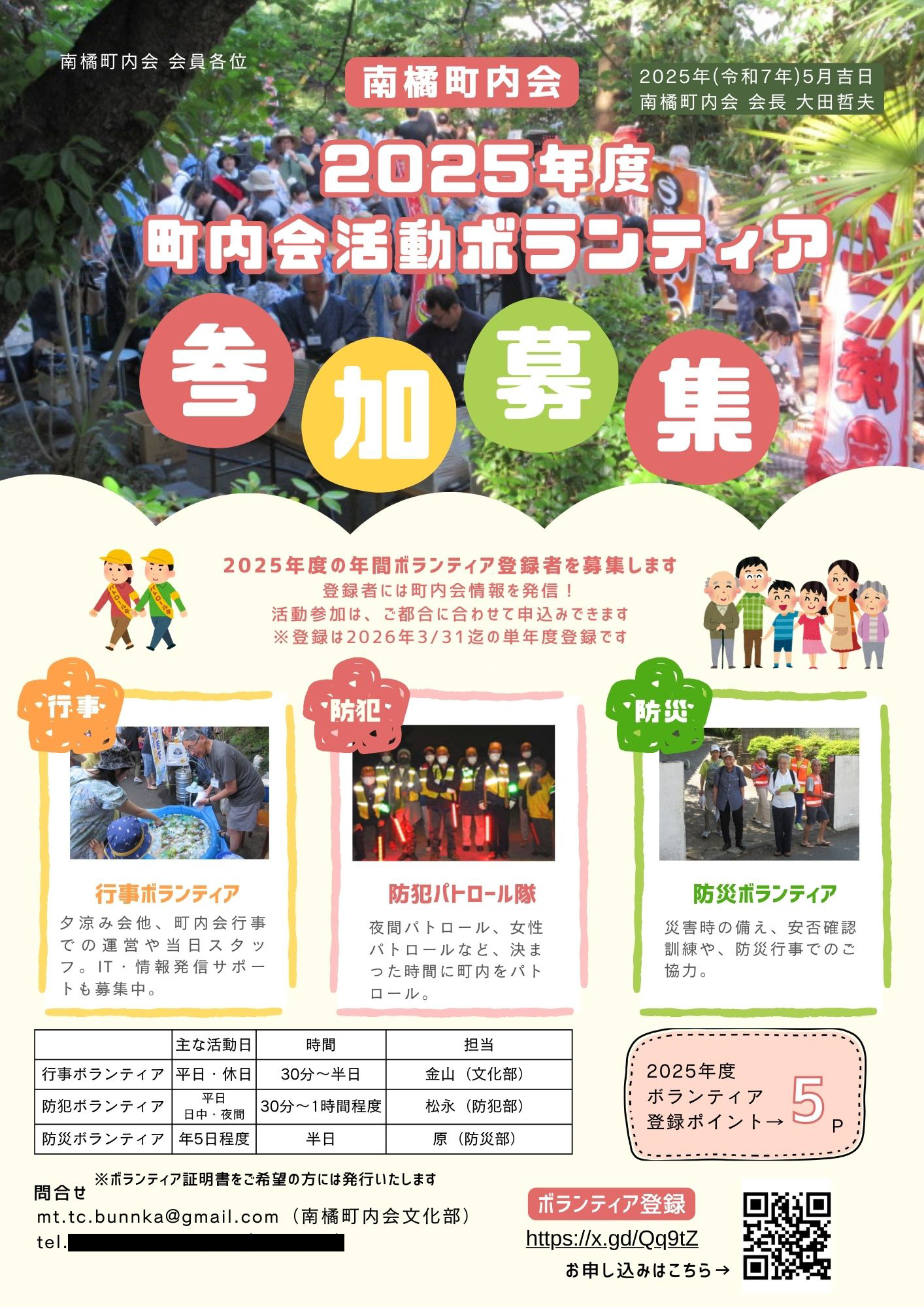 町内会からのお知らせ印刷2025/05/08 17:32 投稿者:財津はじめました‼「南橘町内会ポイントカード」と「町内会活動ボランティア参加募集」! 今年は「南橘町内会創立50周年」です。そこで創立50周年記念「南橘町内会ポイントカード」をはじめました!町内会行事参加でポイントをためて素敵な景品をゲットしましょう!また町内会では行事・防犯・防災活動に参加していただける町内会活動ボランティアを募集します。ボランティア登録するとポイントがもらえます。チラシのQRコードからも簡単に登録できます。皆さんの参加をお待ちします! ※「南橘町内会ポイントカード」は5月10日配布回覧で全戸配布されました。 南橘町内会のページへ戻る