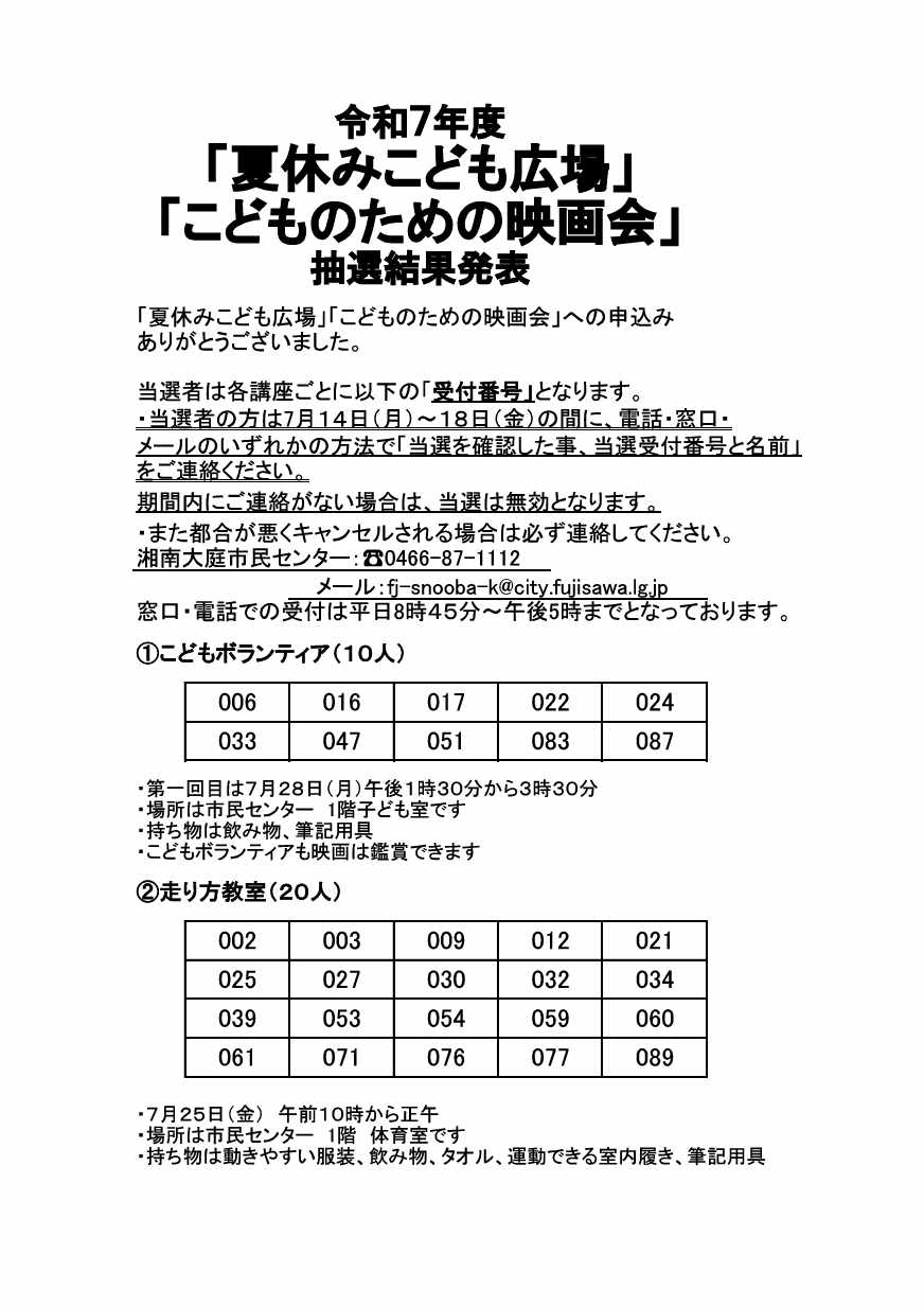 市民センター・公民館印刷2025/07/14 15:00 投稿者:湘南大庭市民センター「夏休みこども広場」「こどものための映画会」 抽選結果発表「夏休みこども広場」「こどものための映画会」への申込みありがとうございました。 夏やすみこども当選者発表.pdf ふらっと湘南大庭へ戻る