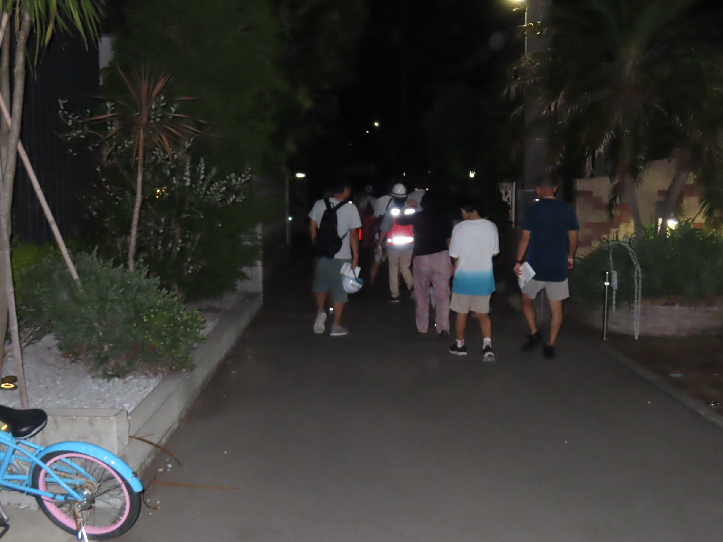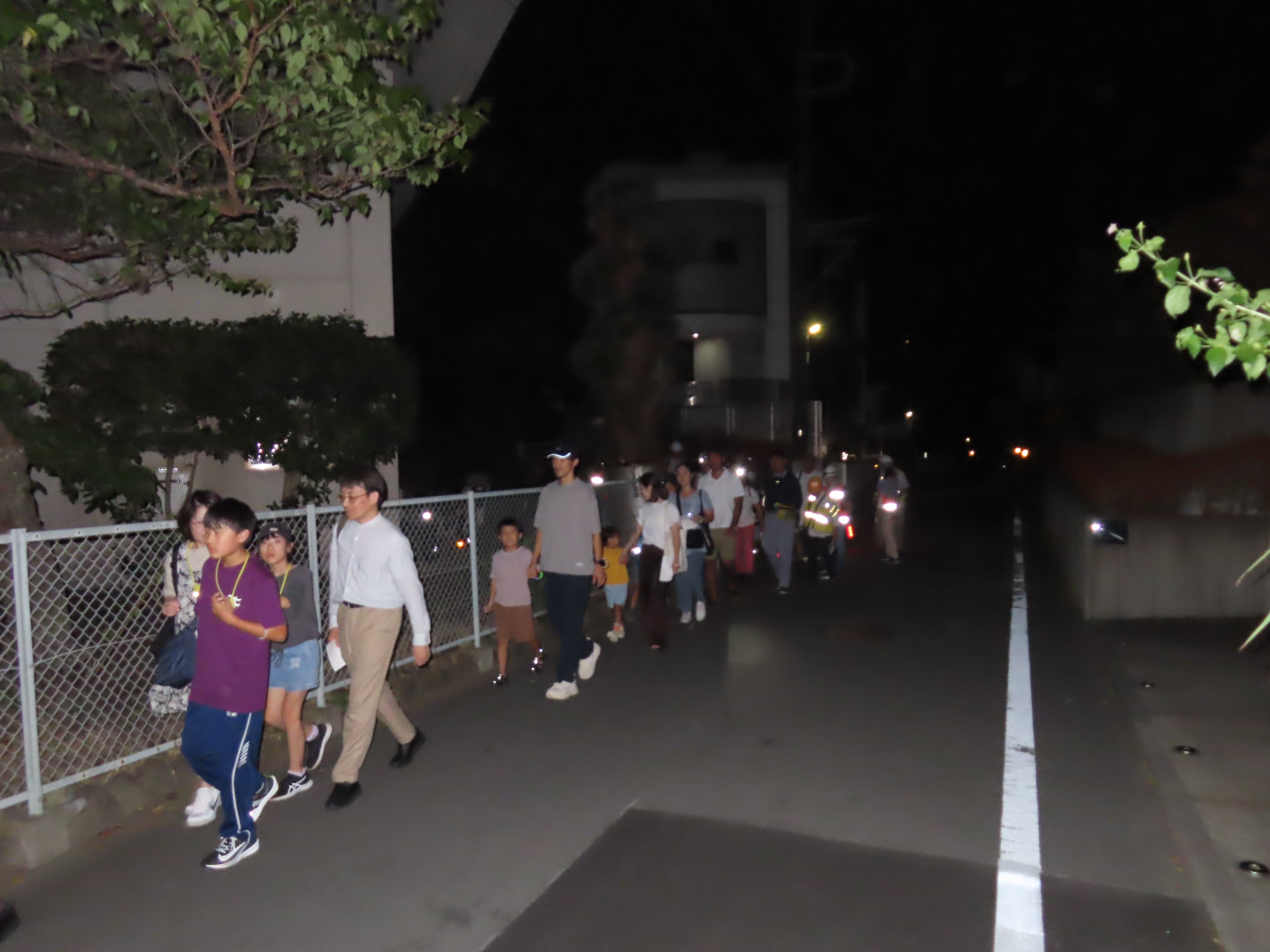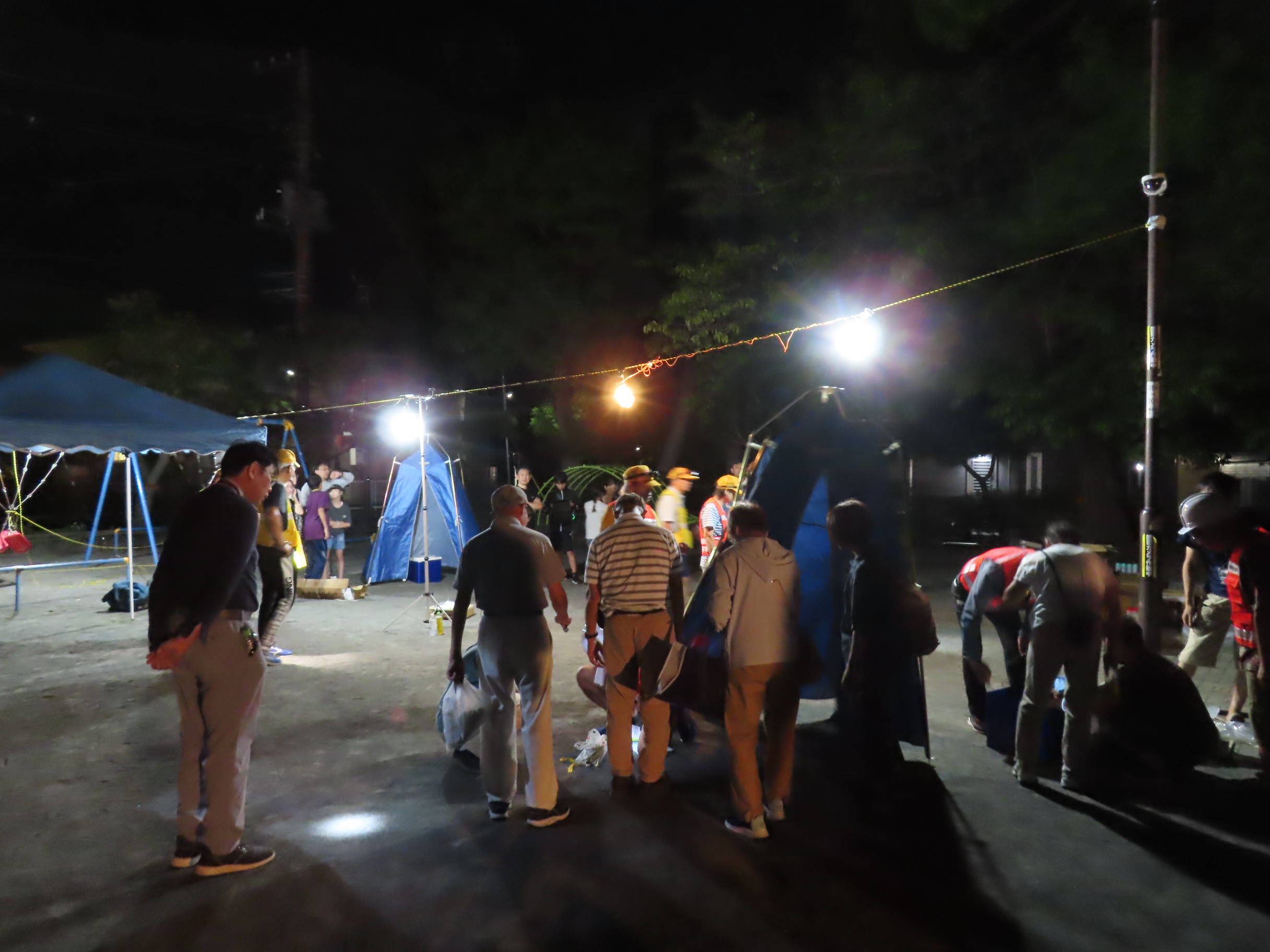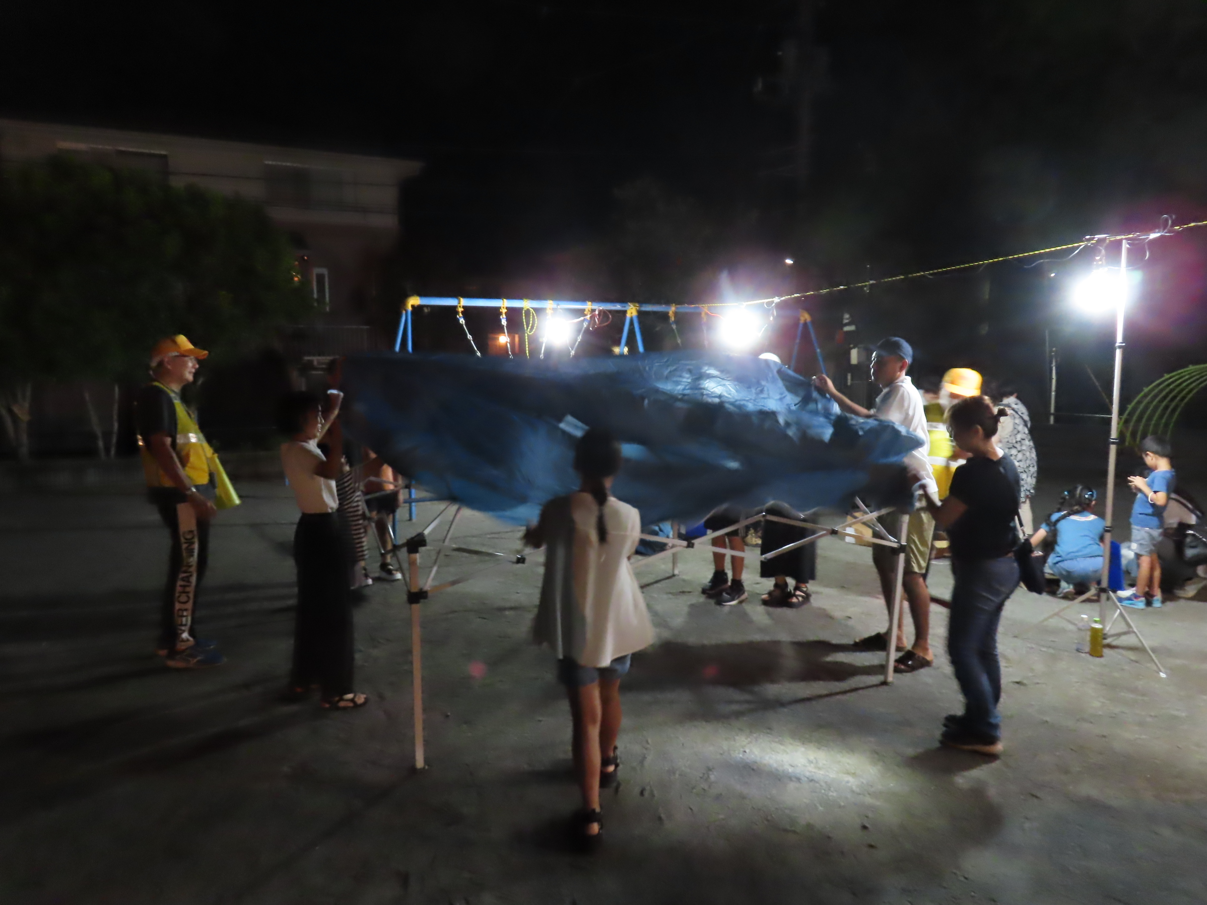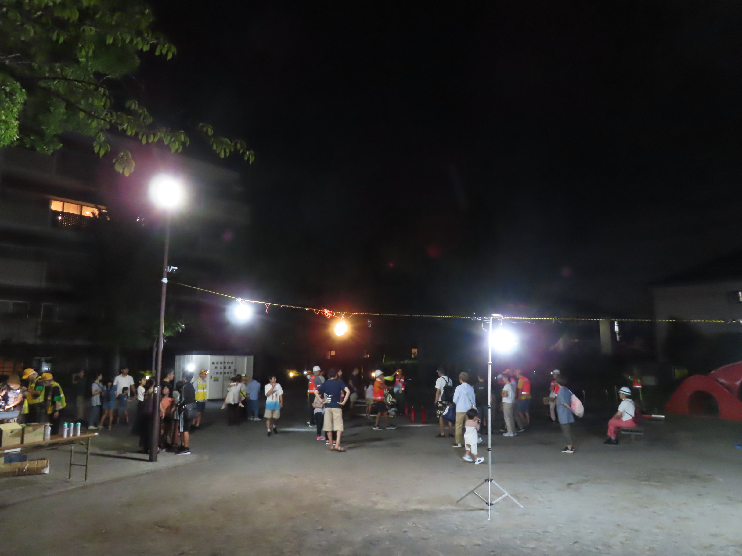 9月6日(土)18時40分~21時まで「夜の防災・防犯まち歩き」(防災部・防犯部共催 協力:パトロール隊)が「タコ公園(橘公園)」をメイン会場に行われ、子どもさん16名を含む66名が参加しました。夕方から役員・組長・町内会有志の方が防災機材を町内3カ所の防災倉庫からメイン会場の「タコ公園」に運び込み、会場のセッティングをして準備は完了。参加者は18時40分に一時(いっとき)避難場所の「タコ公園」「ちちぶ公園」「天理教会」にそれぞれ集合後、安全のためサイリウムを手首につけ、防犯部役員の先導で30分ほど防災オリエンテーリング(危険な場所・消火栓等防災設備の確認)をしながら、メイン会場の「タコ公園」へ向かいました。「タコ公園」に再集合後、参加者にはまず水分補給用の飲料が配られ、公園の灯りを消してから(藤沢市許可済)夜間防災訓練がスタート。3台の発電機作動体験後(日頃のメンテナンスでスムーズに作動)、発電機を電源に作業エリアの投光器2台とワークライトで会場の灯りを確保、大型テント3張りと簡易トイレ(+トイレ用テント)3セットを手際よく組み立てました。また、今回は非常食(ご飯・スープ・パスタなど)の試食が行われ、子どもさん中心に訓練用消火器を使った防災射的も体験、訓練終了後に参加賞として作業グローブと子どもさんにはアイスが配られました。参加者の皆さん、夜遅くまで大変お疲れ様でした!また撤収にもご協力いただきありがとうございました!防災部・防犯部はじめ町内会役員・組長・パトロール隊・町内会有志の皆さん、大変お疲れ様でした!