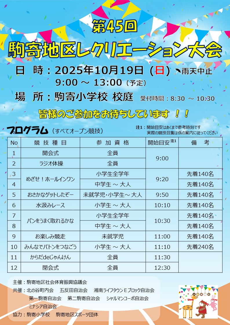 お知らせ印刷2025/09/24 15:38 投稿者:ユーS第45回駒寄地区レクリエーション大会開催のお知らせ駒寄地区レクリエーション大会を開催します 日時 : 2025年10月19日(日)9時~13時 場所 : 駒寄小学校グラウンド 雨天中止 当日7時にこのHPで開催/中止をお知らせします 駒寄小学校区のみなさま 奮ってご参加ください 駒寄地区社会体育振興協議会へ戻る