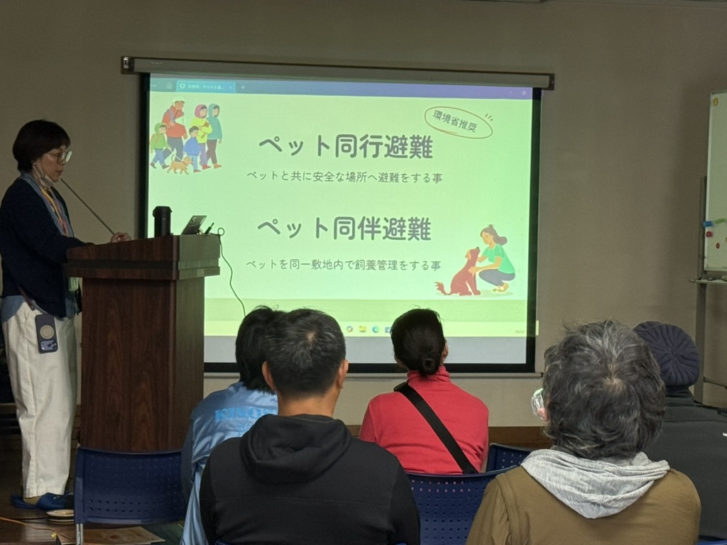 2025年11月9日(日)、木の下会館で行われた木の下町内会防災訓練で「ペット防災」の講座を行いました。10月4日の向原町内会での講座と同じく、ペット災害危機管理士®講座の講師でもあり、HSVNメンバーでもある石井祐子さんが講師を務めました。