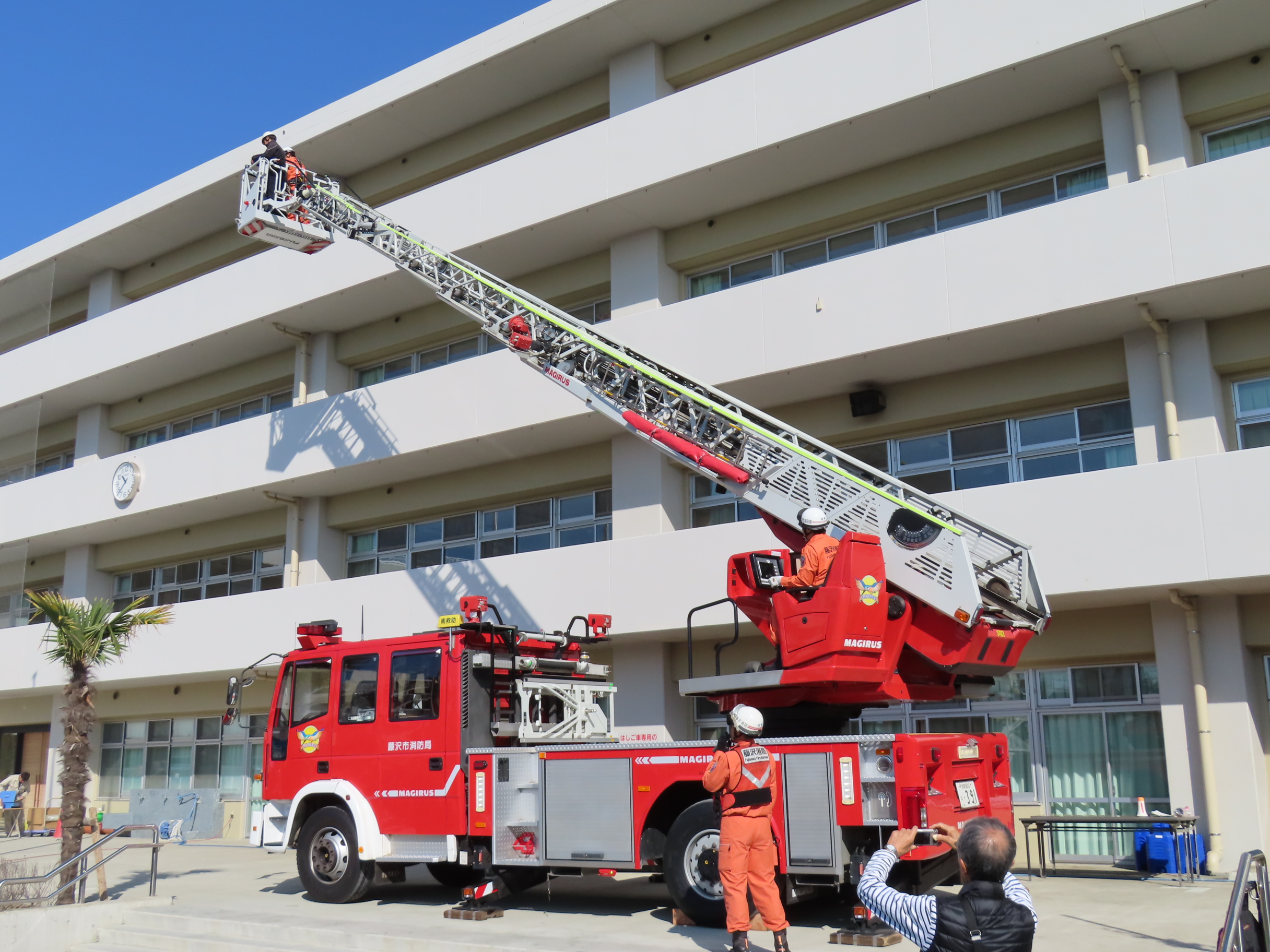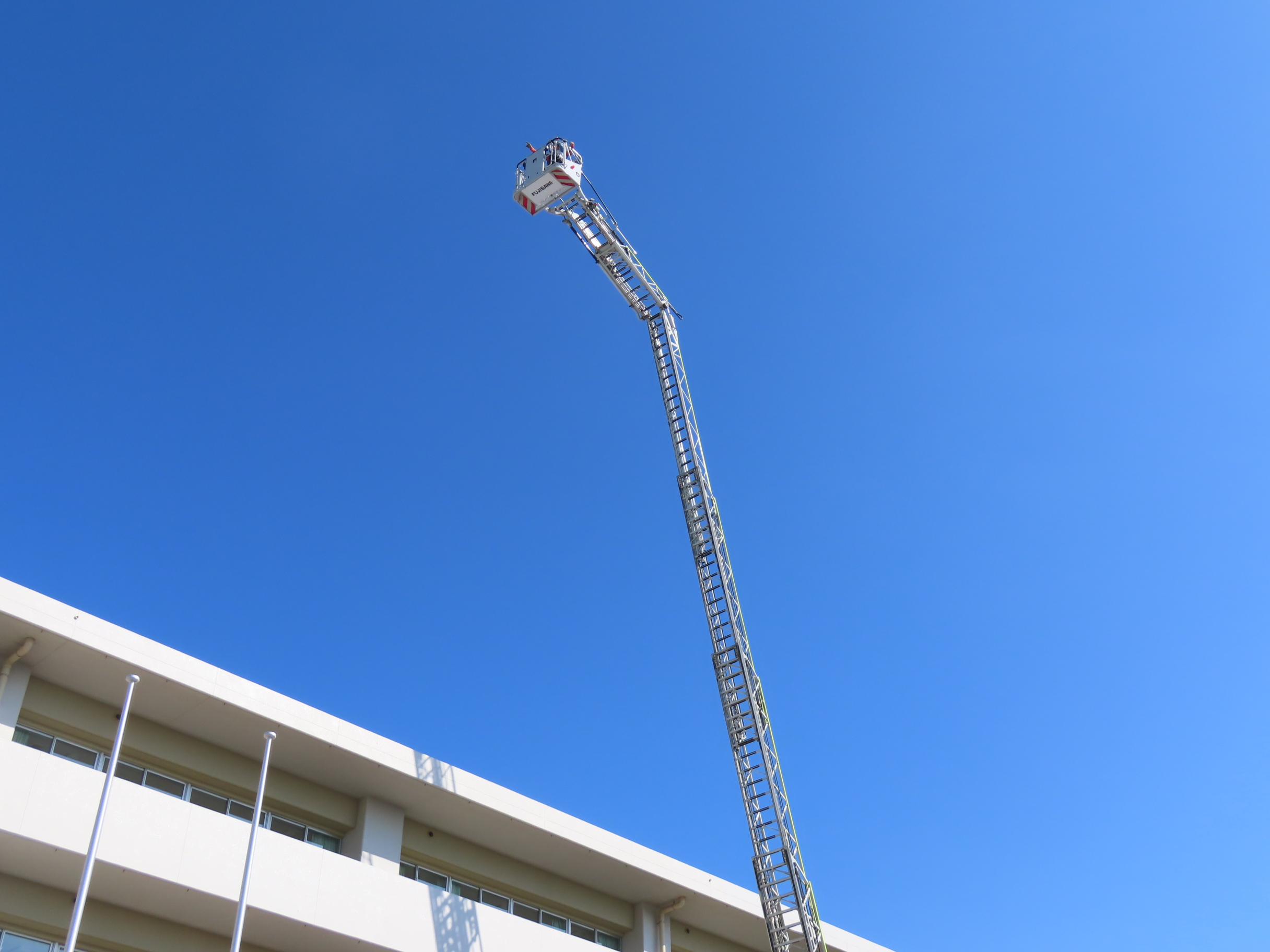 写真上段左から2・3番目:はしご車のクレーンの高さは28メートル、9階相当です。