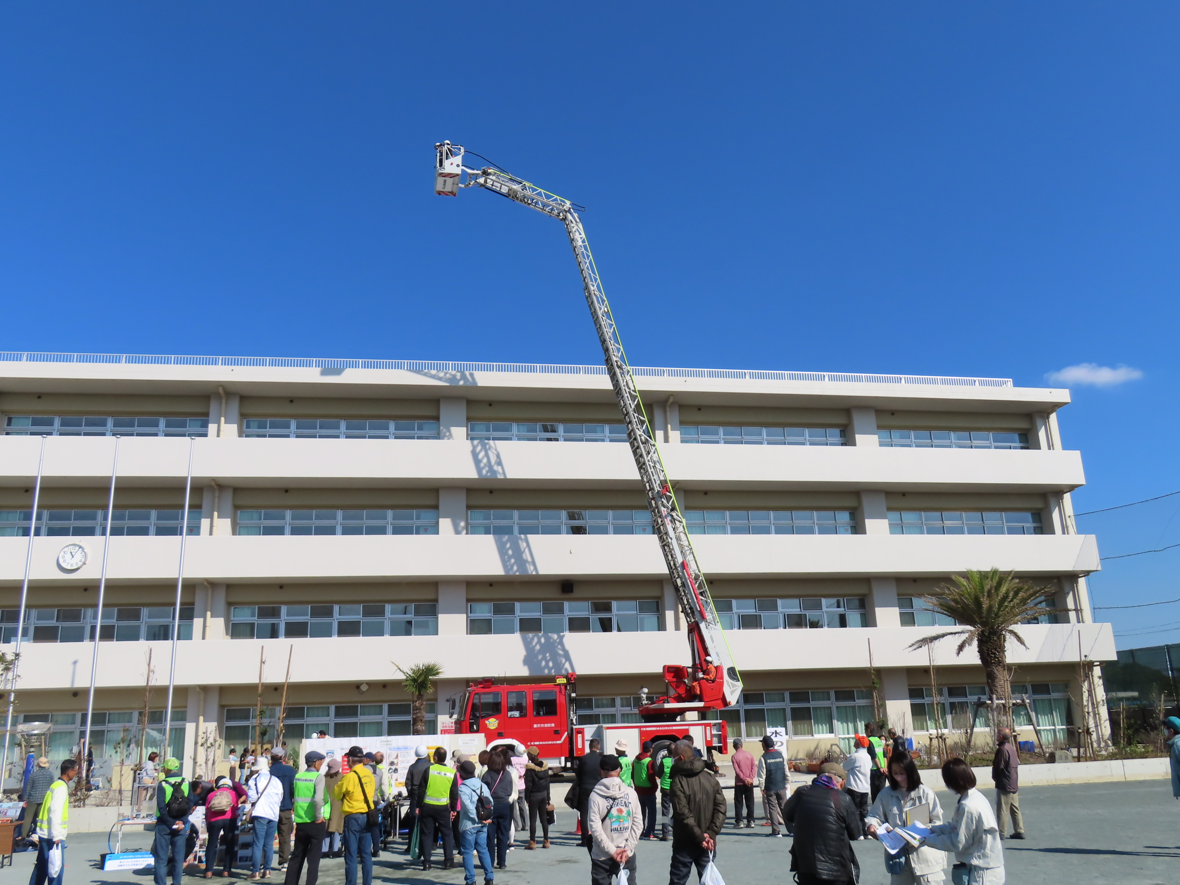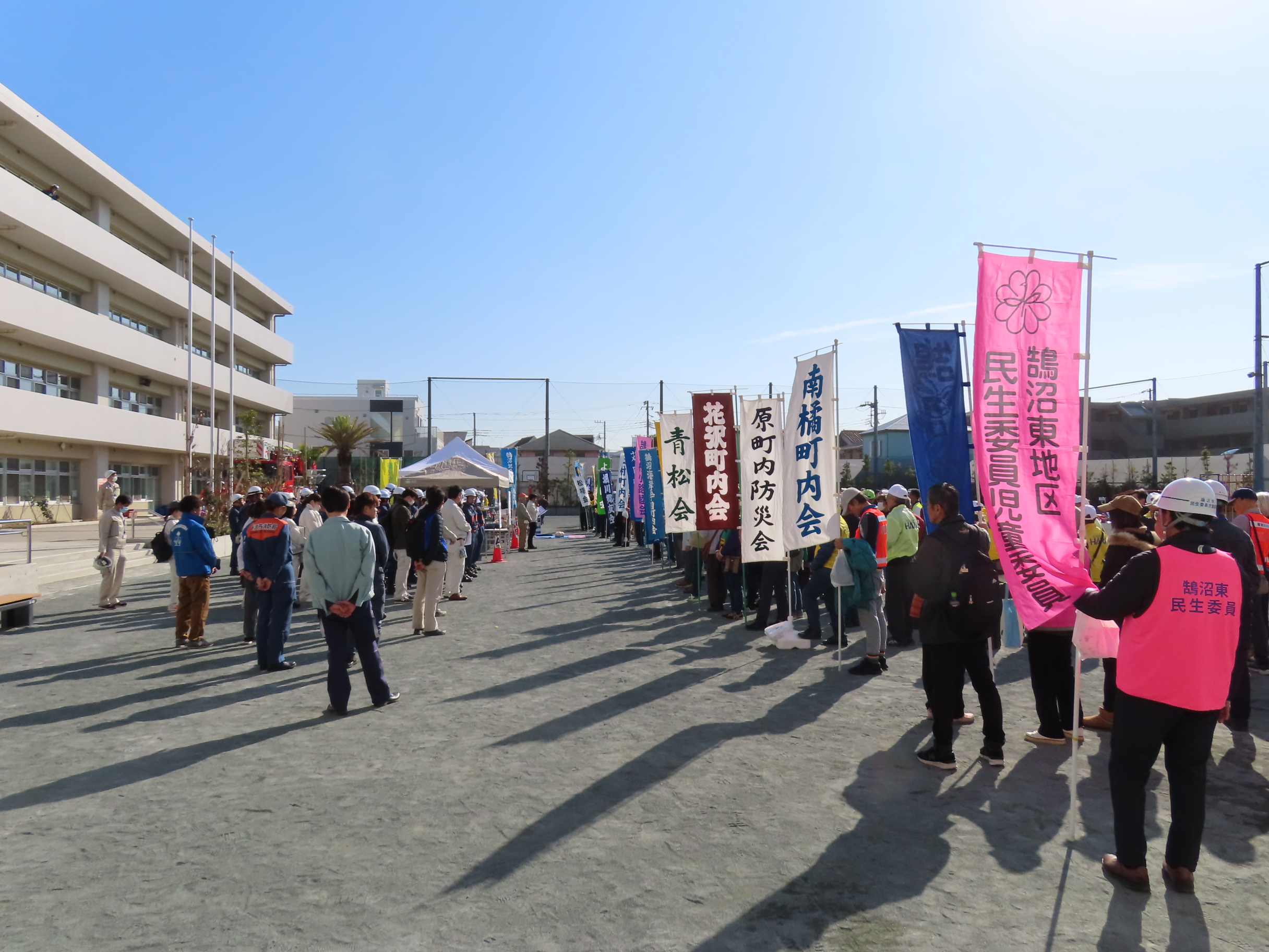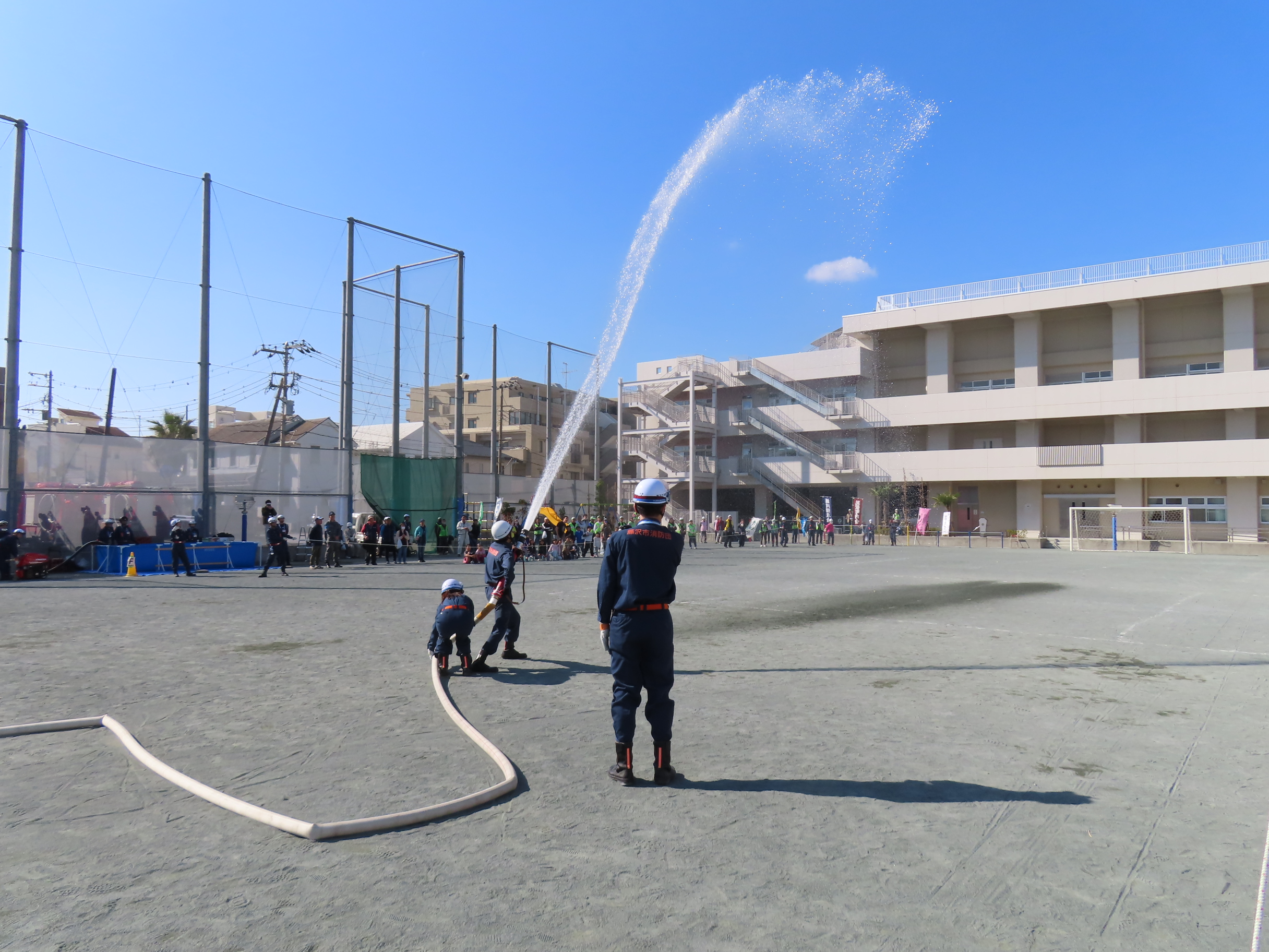 11月15日(土)午前10時~11時50分まで「鵠沼地区総合防災訓練」(主催:鵠沼地区町内会自治会連合会・鵠沼地区防災協議会・鵠沼市民センター)が「備えよ、常に。各団体と力を合わせ。鵠沼地区の防災力を向上させよう!」のスローガンのもと「鵠南小学校で」開催され、鵠沼地区の65町内会・自治会・団体から総勢254名が参加。南橘町内会は防災部の音頭取りで大田会長はじめ9名が参加しました。目玉の「はしご車による救助体験」や「浸水歩行訓練」「簡単に組み立て・設置できる紙製トイレ展示」「災害時のペットの扱い」「土嚢より扱いやすい水嚢の使い方」「洋式便器を使っての簡易トイレの使い方」「救命救急訓練」などなど様々な訓練・展示があり、訓練最後の「鵠沼地区消防団第4分団」による「放水操作訓練」は圧巻の迫力でした。