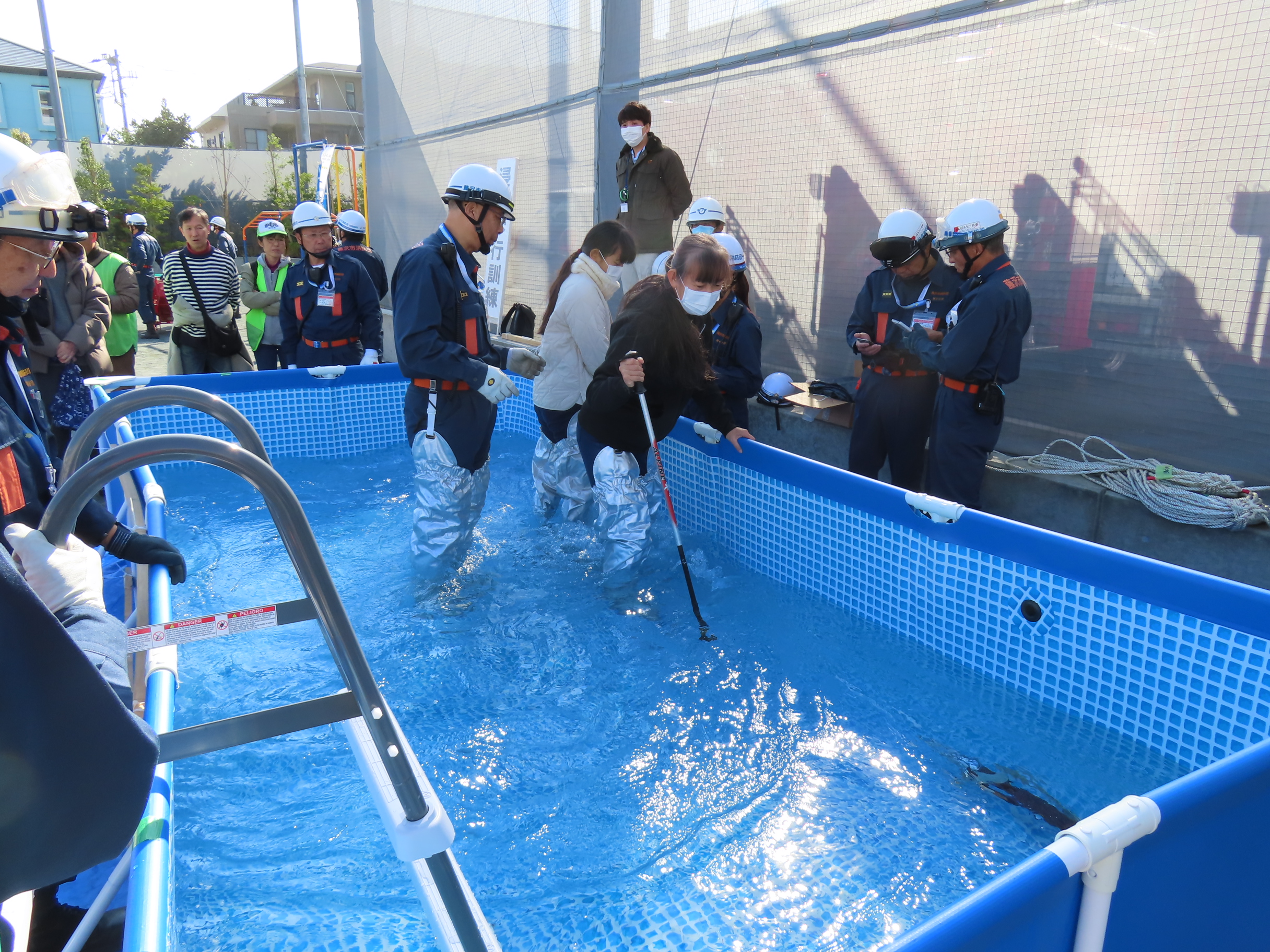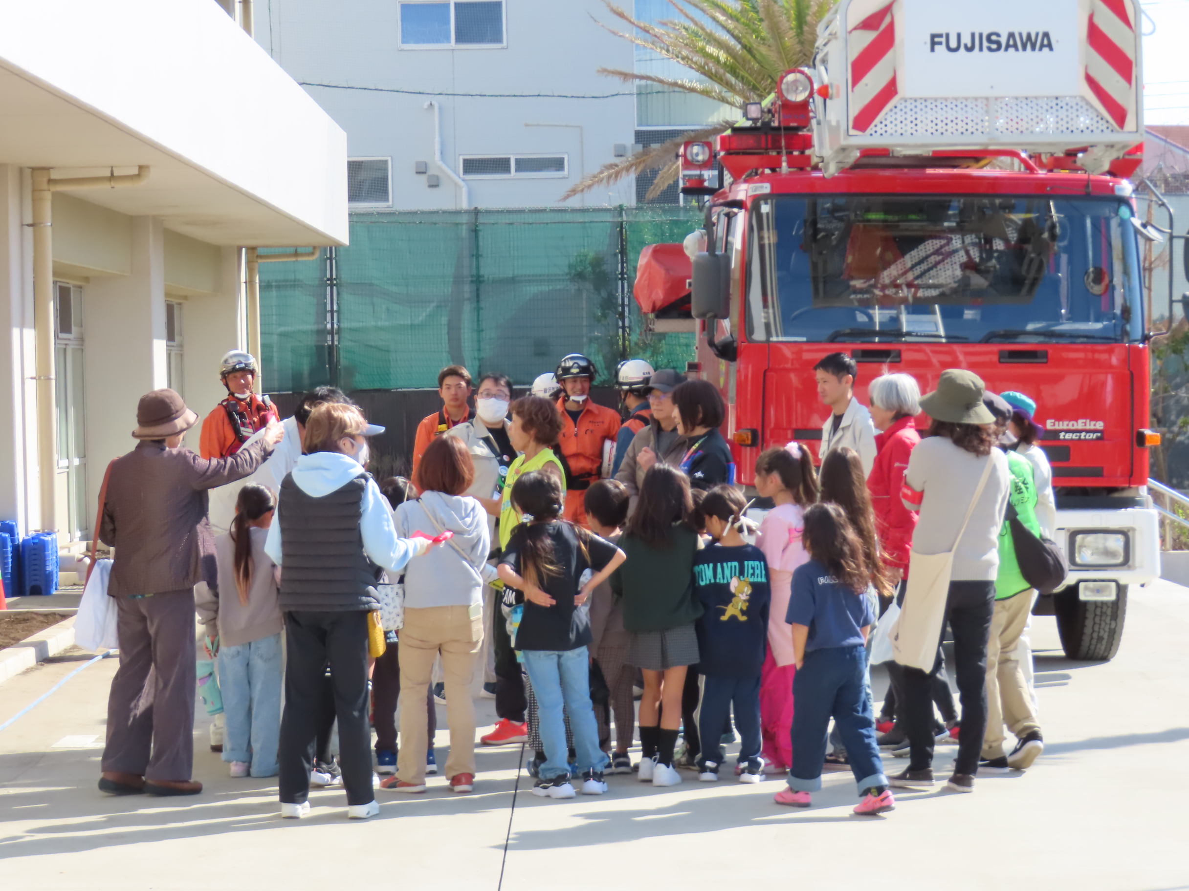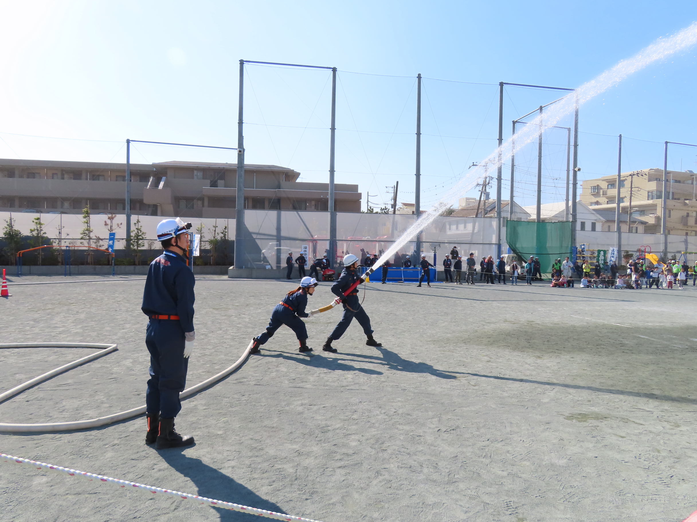 11月15日(土)午前10時~11時50分まで「鵠沼地区総合防災訓練」(主催:鵠沼地区町内会自治会連合会・鵠沼地区防災協議会・鵠沼市民センター)が「備えよ、常に。各団体と力を合わせ。鵠沼地区の防災力を向上させよう!」のスローガンのもと「鵠南小学校で」開催され、鵠沼地区の65町内会・自治会・団体から総勢254名が参加。南橘町内会は防災部の音頭取りで大田会長はじめ9名が参加しました。目玉の「はしご車による救助体験」や「浸水歩行訓練」「簡単に組み立て・設置できる紙製トイレ展示」「災害時のペットの扱い」「土嚢より扱いやすい水嚢の使い方」「洋式便器を使っての簡易トイレの使い方」「救命救急訓練」などなど様々な訓練・展示があり、訓練最後の「鵠沼地区消防団第4分団」による「放水操作訓練」は圧巻の迫力でした。