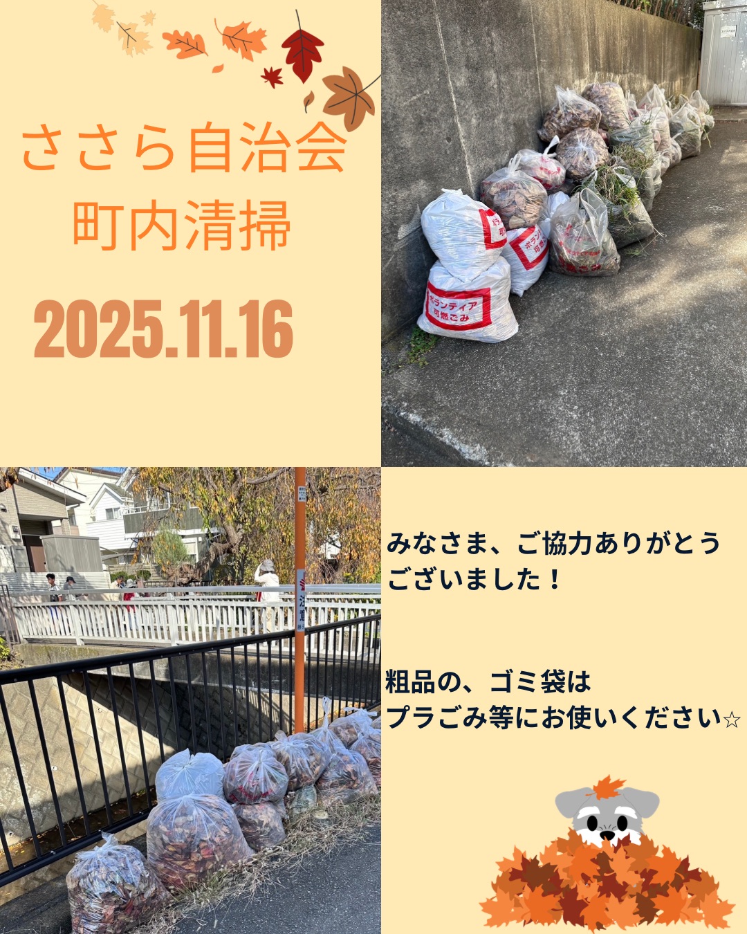 回覧・配布印刷2025/11/19 00:21 投稿者:ささら自治会ささら自治会町内清掃を実施しました2025.11.16 ささら自治会町内清掃を実施しました。 みなさまのご協力で、町がきれいになりました。 ありがとうございました!! 粗品の45ℓ半透明ごみ袋は、プラゴミ等にお使いください⭐︎ 藤沢市 ささら自治会へ戻る
