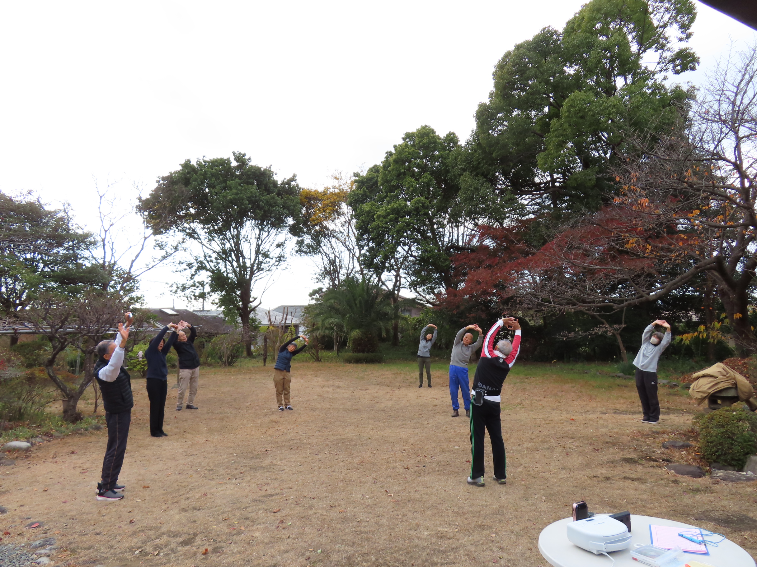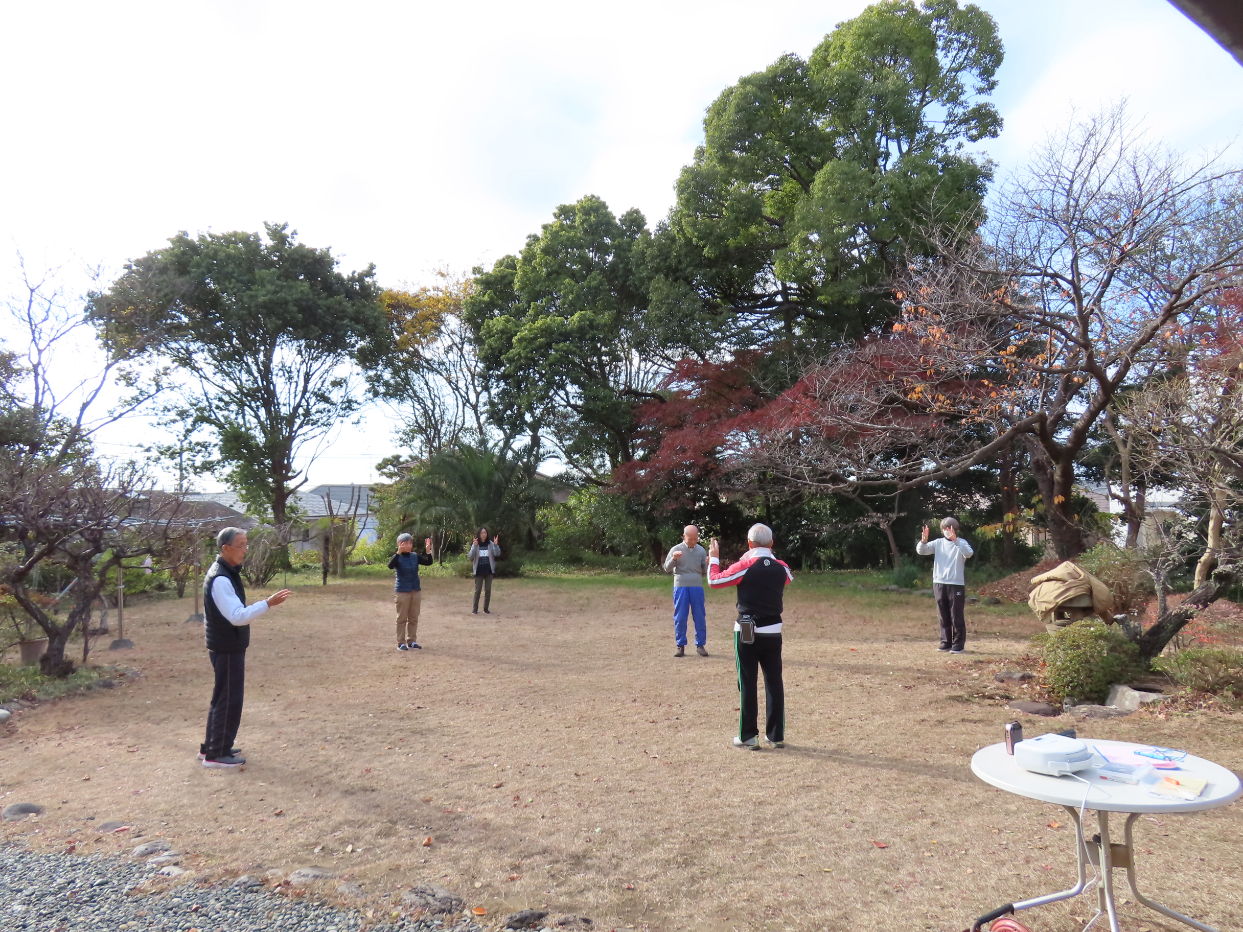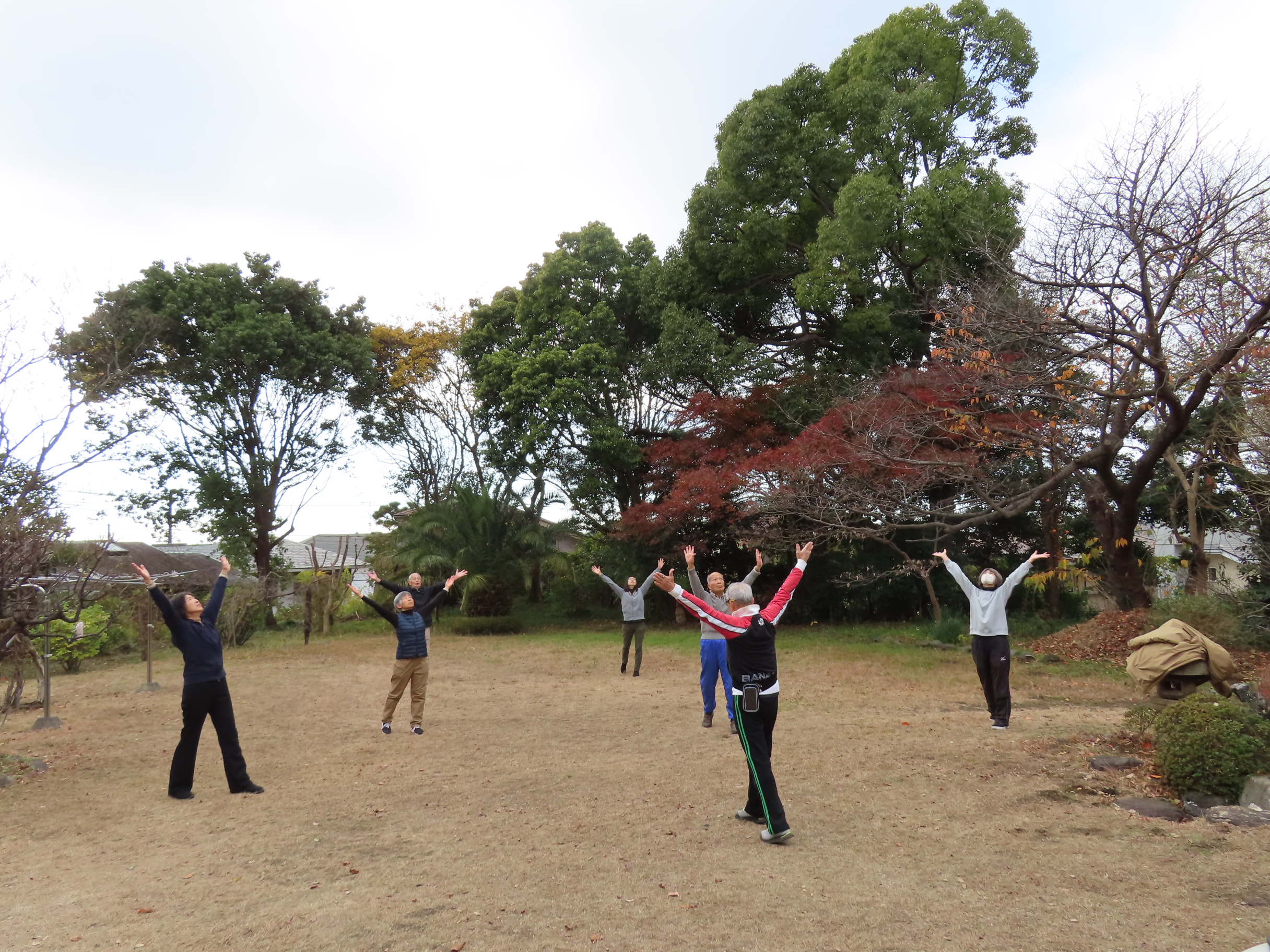 12月18日(第3木曜日)9時半から今年最後の「みんな de 体操」が「天理教会芝生のお庭」で行われ8名が参加しました。今年は雨で1回だけ中止となりましたが、「みんな de 体操」は不思議とお天気に恵まれます。今日も秋山健康運動指導士の指導でまずは「脳トレ」からスタート。足踏みしながらの両指カウントや「キツネとウサギ」「ピストルと的」を両手で交互に作る動きなど、なかなか上手くいきませんがこの混乱こそが脳を活性化させるそうです。続く「手足ジャンケン」はスローテンポならかろうじてついていけましたが、アップテンポになるともうお手上げでした。ストレッチの肩甲骨の上下・前後・回転の運動は腕の動きがスムーズなるそうで、おかげさまでホッと一息つけました。最後は皆さんもすっかりマスターした「かわせみ体操」で締めくくり、今日も充実の30分でした。秋山先生、今年も1年間ご指導いただきありがとうございました!皆さんも1年間お疲れ様でした!文化部さん、お世話になりました!来年もよろしくお願いします!