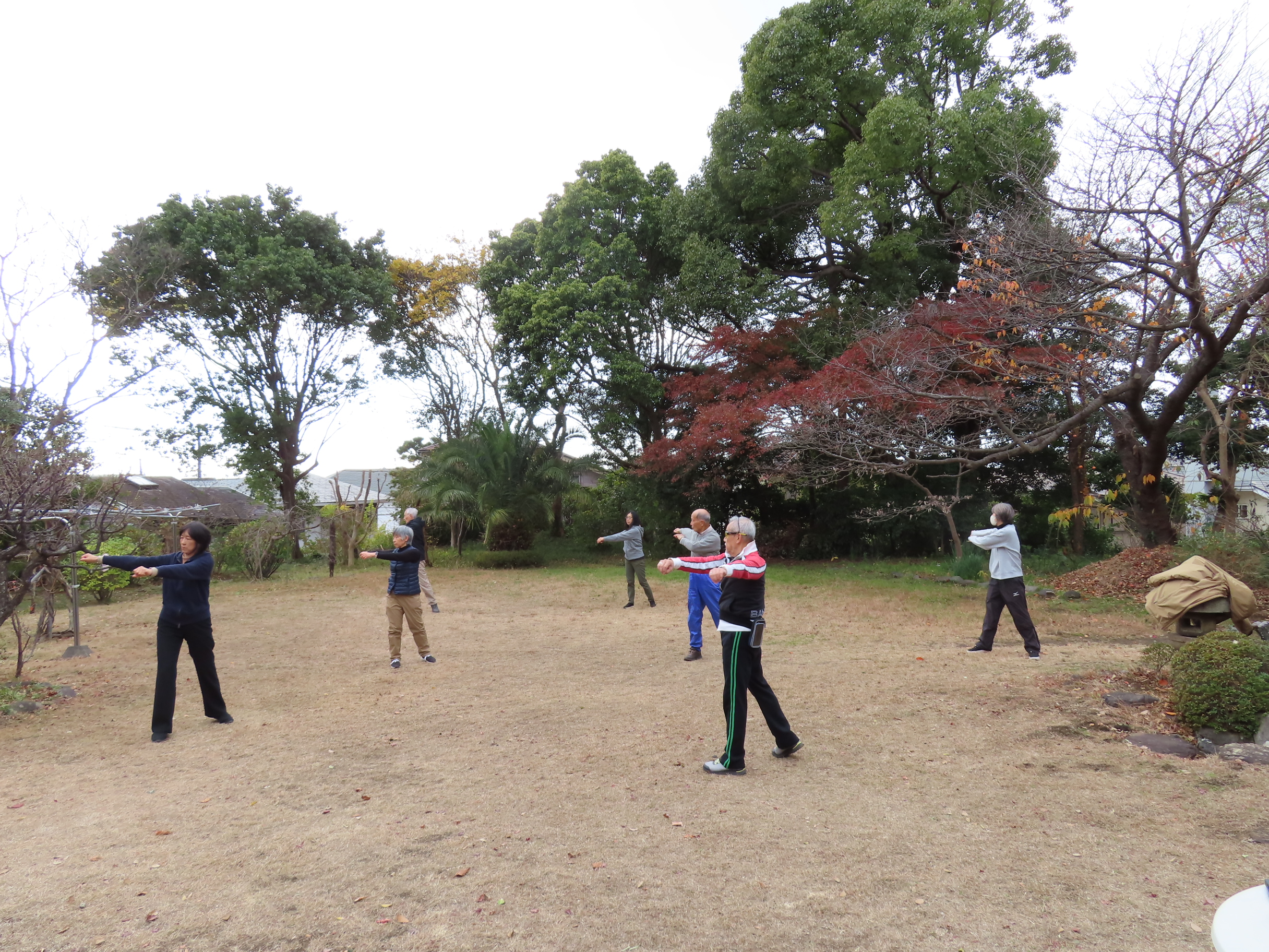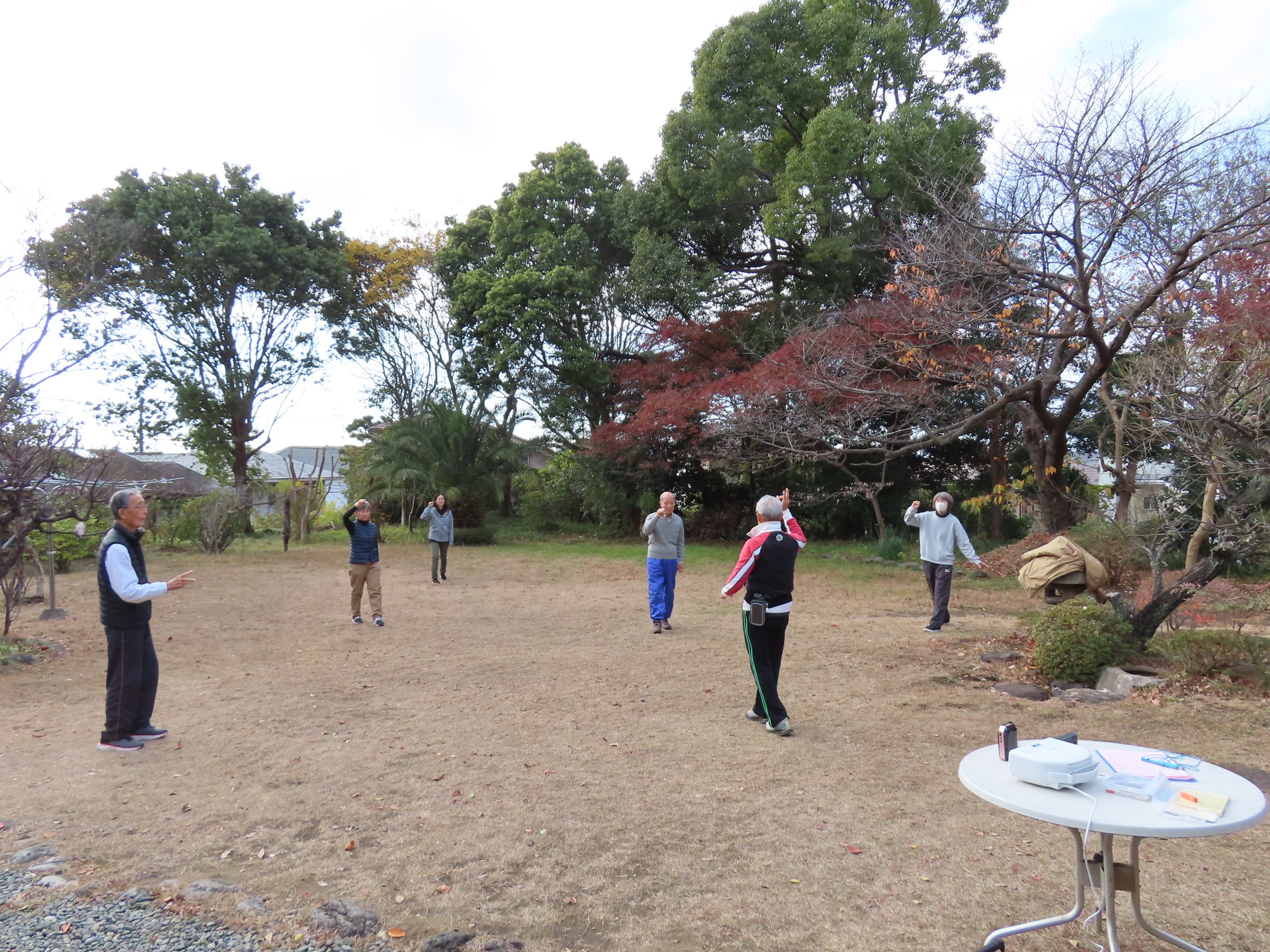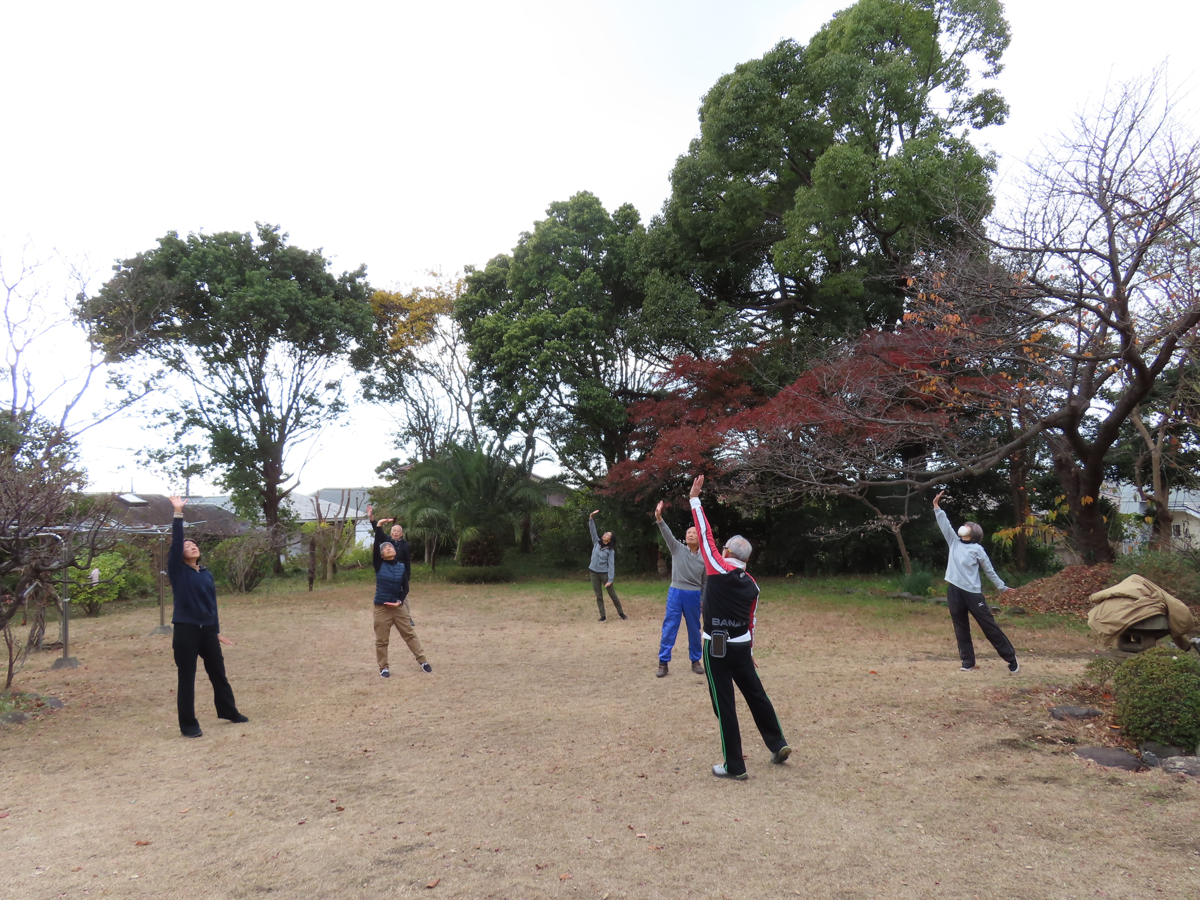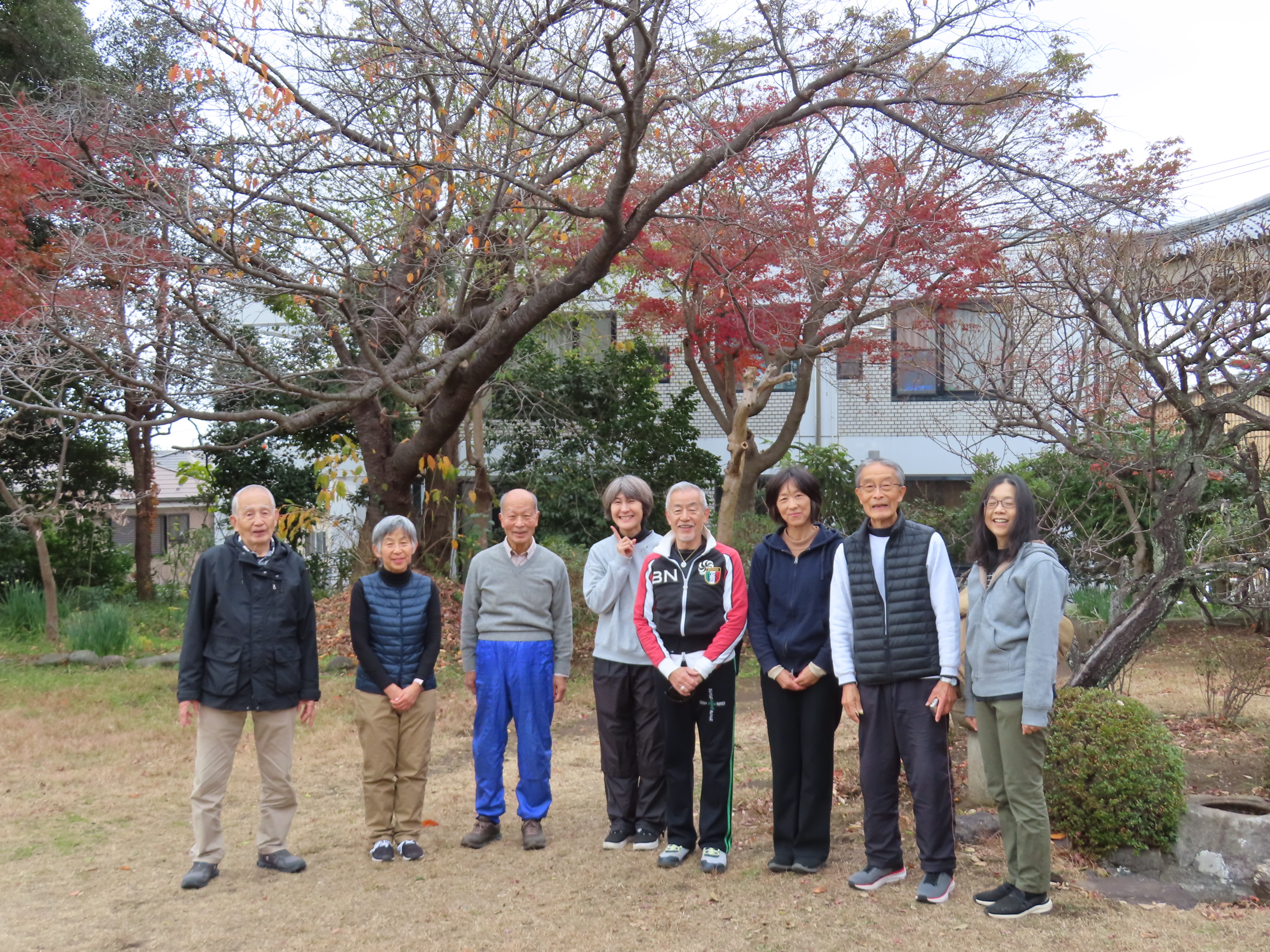 12月18日(第3木曜日)9時半から今年最後の「みんな de 体操」が「天理教会芝生のお庭」で行われ8名が参加しました。今年は雨で1回だけ中止となりましたが、「みんな de 体操」は不思議とお天気に恵まれます。今日も秋山健康運動指導士の指導でまずは「脳トレ」からスタート。足踏みしながらの両指カウントや「キツネとウサギ」「ピストルと的」を両手で交互に作る動きなど、なかなか上手くいきませんがこの混乱こそが脳を活性化させるそうです。続く「手足ジャンケン」はスローテンポならかろうじてついていけましたが、アップテンポになるともうお手上げでした。ストレッチの肩甲骨の上下・前後・回転の運動は腕の動きがスムーズなるそうで、おかげさまでホッと一息つけました。最後は皆さんもすっかりマスターした「かわせみ体操」で締めくくり、今日も充実の30分でした。秋山先生、今年も1年間ご指導いただきありがとうございました!皆さんも1年間お疲れ様でした!文化部さん、お世話になりました!来年もよろしくお願いします!