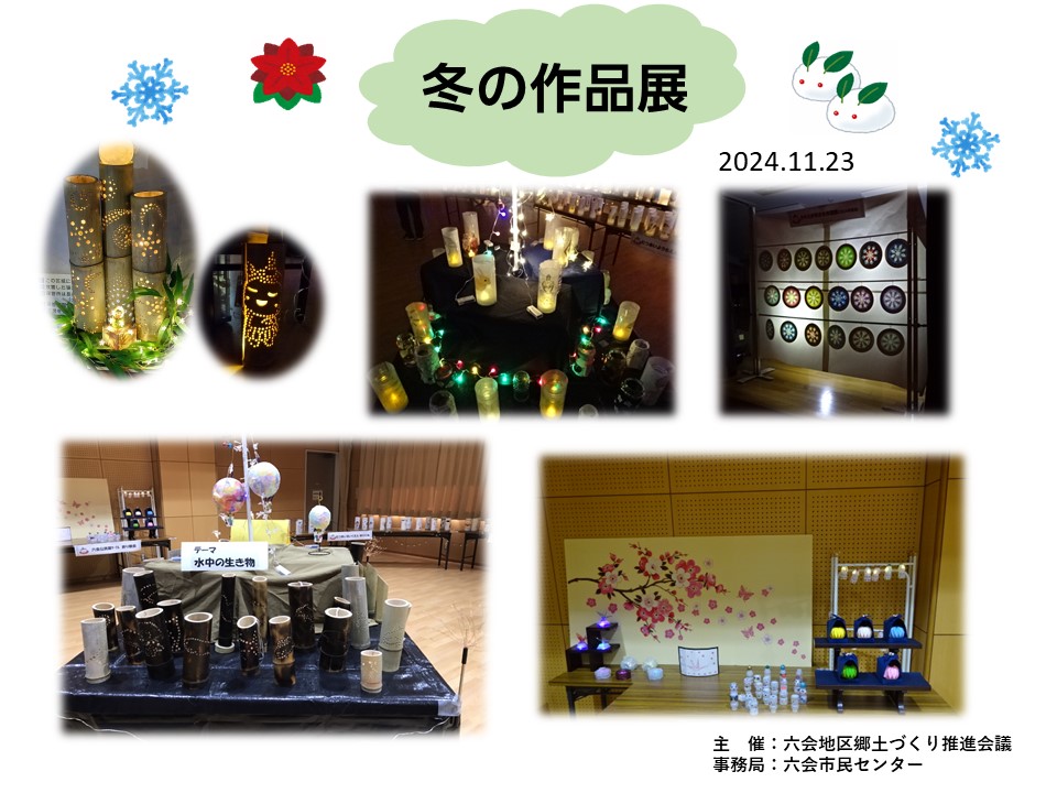 お知らせ印刷2026/01/07 11:36 投稿者:六会地区ポータル事務局冬の作品展示会を開催します六会地区郷土づくり推進会議では、次のとおり「冬の作品展示会」を実施します。 たくさんの方のご来場をお待ちしています。 日 時 2026年1月17日(土)13時~16時30分 会 場 六会市民センター 3階 ホール 内 容 会場を暗くして、地域の子どもたちのキャンドルホルダーや事業で作成した作品を展示します。 昨年度の様子 六会地区郷土づくり推進会議へ戻る