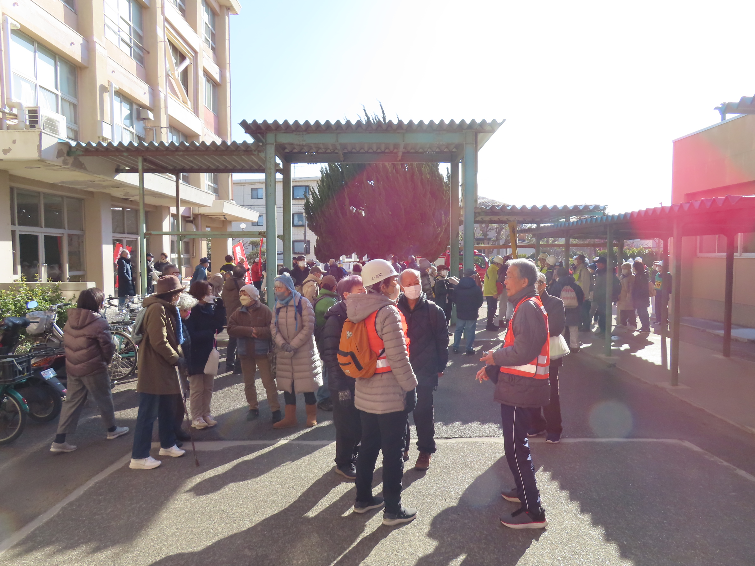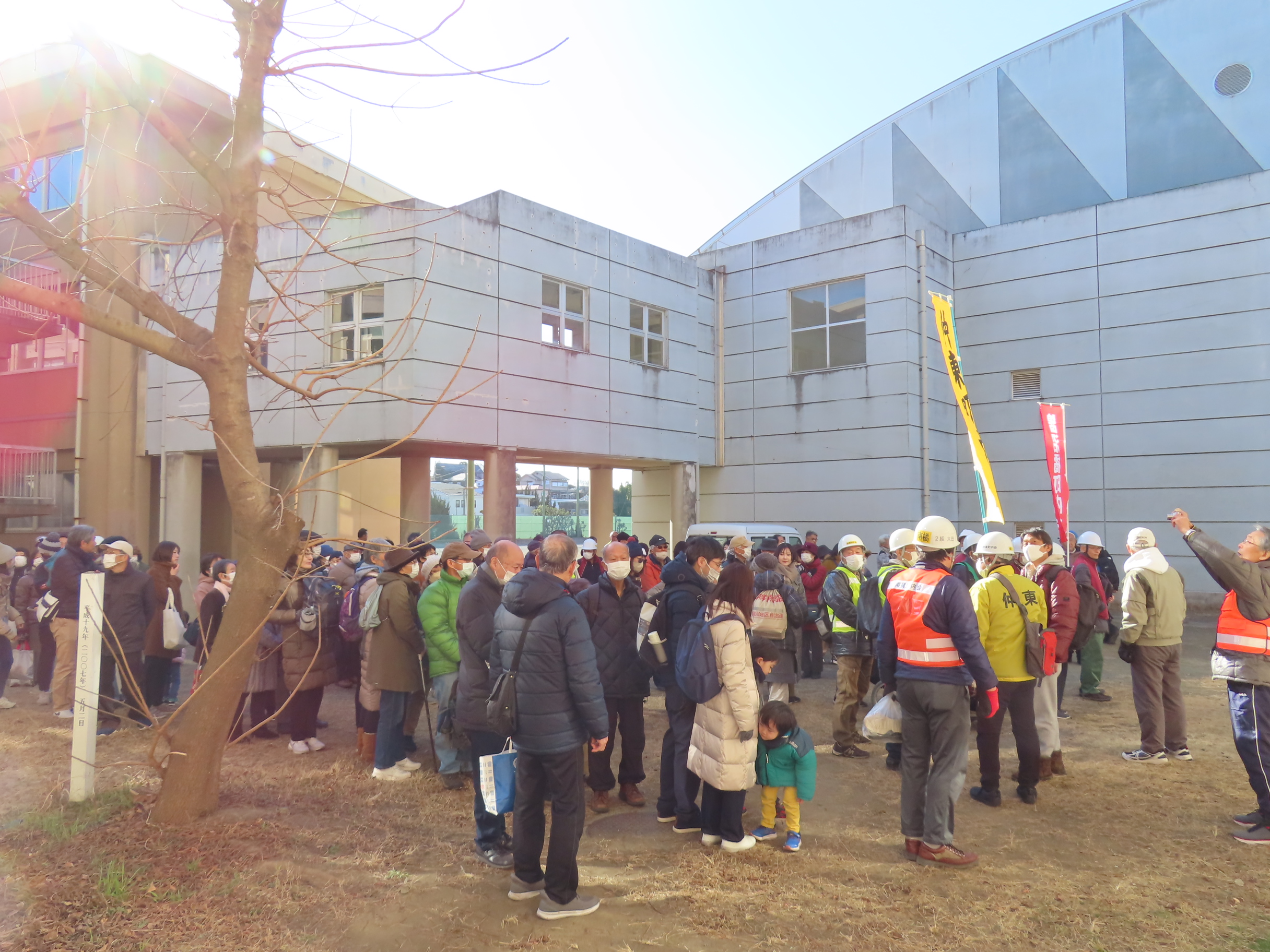 1月31日(土)午前9時~11時過ぎまで「鵠沼中学校」への避難訓練が、鵠沼中学校地区防災連絡協議会・鵠中防災会の主催で行われ、地区7町内会134名が参加、ほかに藤沢消防団第7分団・藤沢警察署・藤沢市役所・鵠沼市民センター職員ら16名もスタッフとして参加しました。南橘町内会からは大田会長はじめ防災部ほかの役員・町内会員総勢43名(子どもさん4名含む)が参加、大勢の町内会員の方々にご協力いただきありがとうございました。