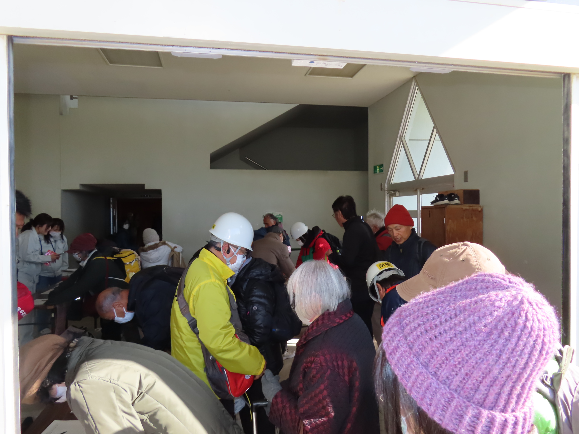 防災部が天理教会に立ち上げた「南橘町内会災害対策本部」(実際は震度5弱で設置)と「ちちぶ公園の防災ポスト」に、「鵠沼中学校」への避難を想定しあらかじめ用意していただいた「安否確認カード」を提出後、参加者は避難施設の「鵠沼中学校」へ向かいました。「安否確認カード」提出は35枚のご協力をいただきました。