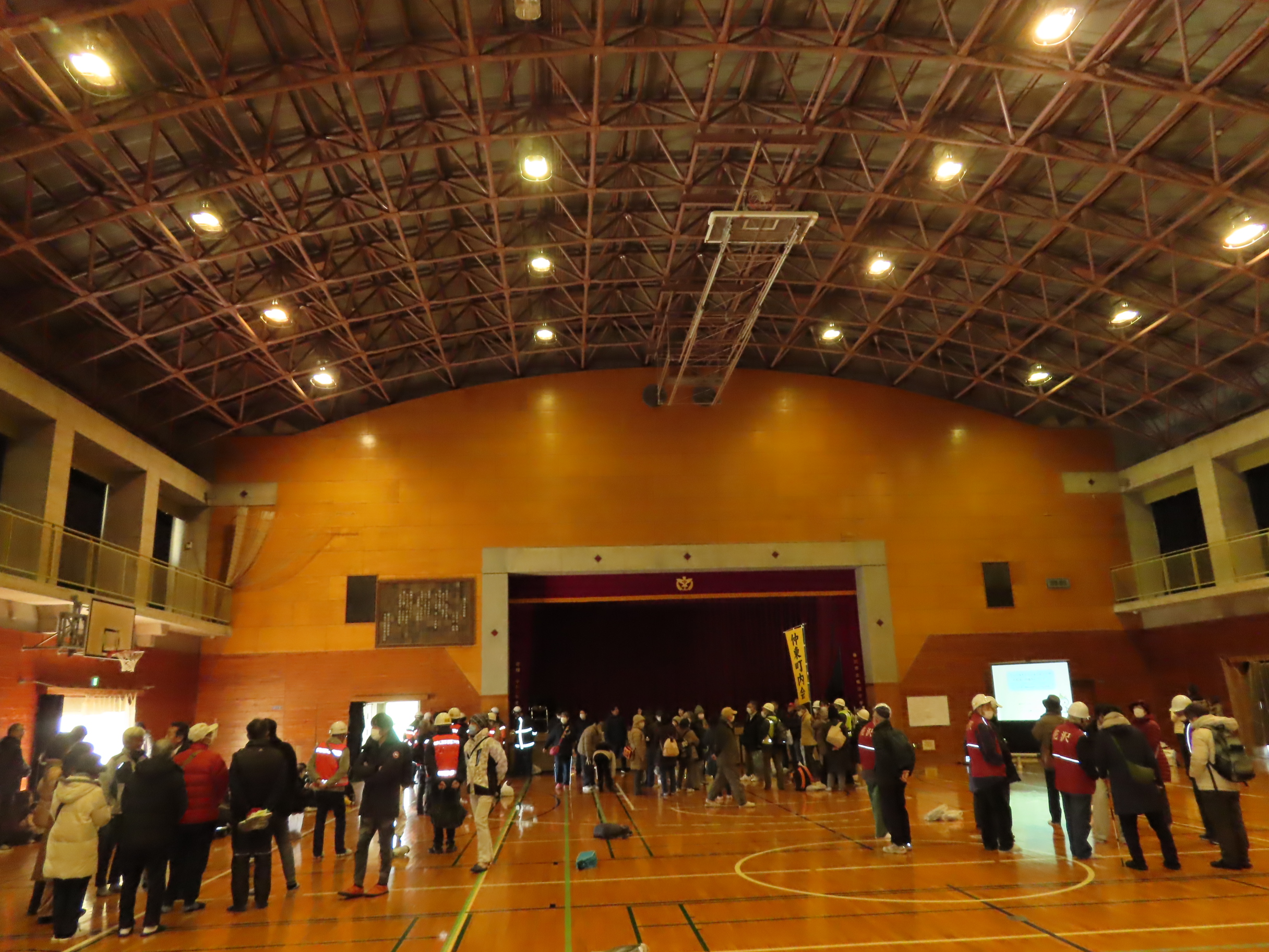 鵠沼中学校では市職員やK委員(各町内会選出の災害時かけつけ員)の指示に従い各町内会ごとに受付し、町内会ごとの体育館避難スペース区画を確認。その後市民センタースタッフより「ファーストミッションボックス(FMB)」=「避難所の運営方法」について「まずは町内会ごとに集合・受付をし避難者の人数把握をする」から避難所開設が始まる旨、スクリーンを使って説明がありました。市職員・K委員さんの的確な指示のおかげで訓練は無事終了しました。皆さん、真冬の寒さの中大変お疲れ様でした!防災部さん、いつも防災訓練を仕切っていただきありがとうございます。皆さん、日ごろから防災準備に心がけましょう。