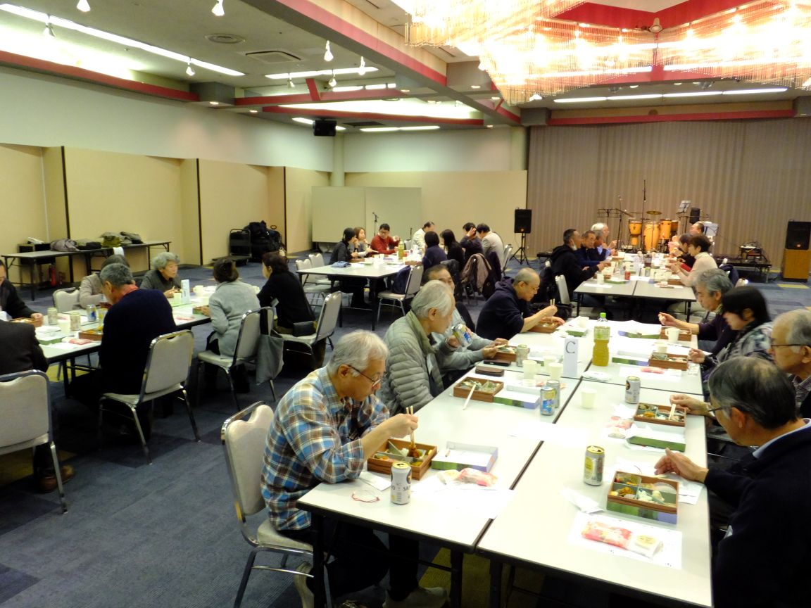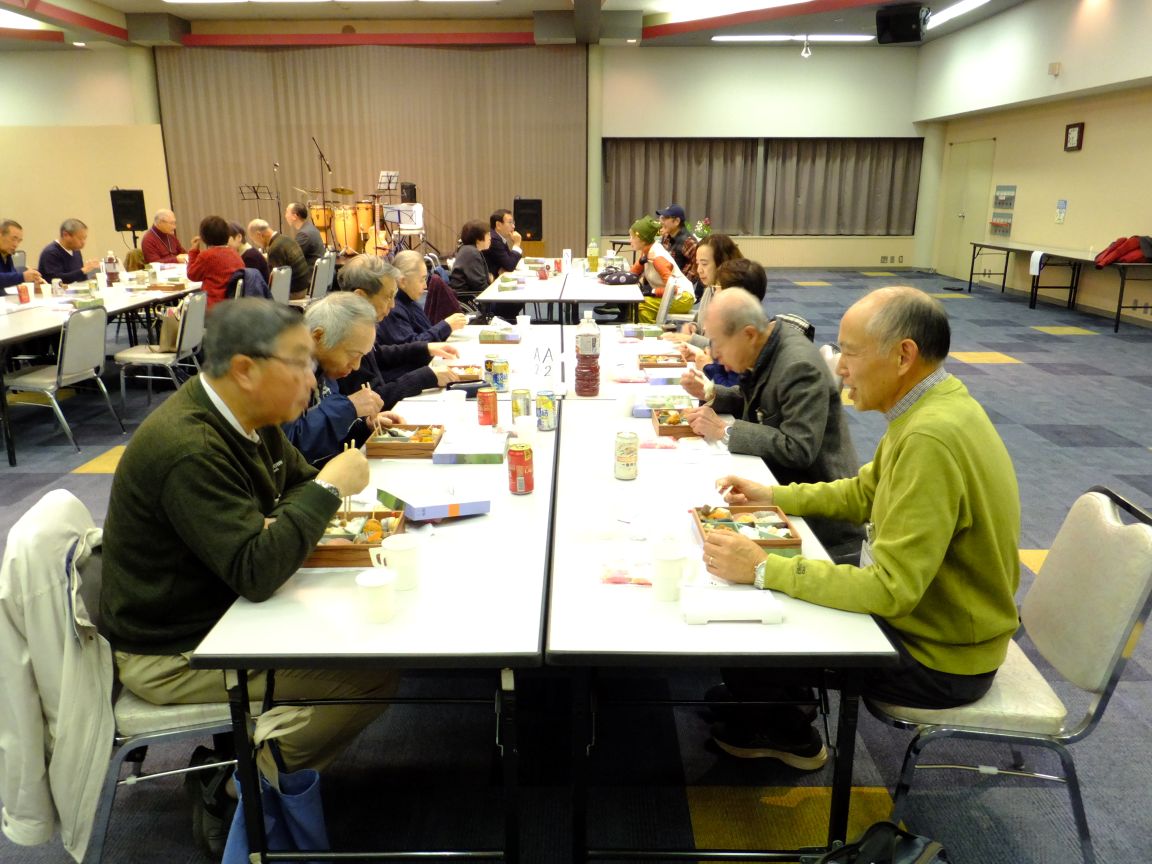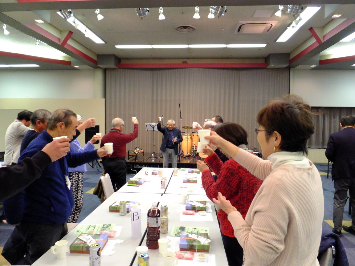 1月31日(土)午後6時から「新年交流会」が藤沢市民会館第1展示集会室で開催され大田会長はじめ役員・組長と町内ボランティア総勢47名の方が参加しました。「新年交流会」は組長・広報物配布担当・防犯パトロール・防災幹事・お助け隊・公園愛護会・おはようボランティアなど町内のボランティア活動にご協力頂いている方々へ、ささやかながら年に一度の感謝と労いの会です。普段なかなか一同には集えない皆さんですが、町内会の事に限らず様々な話題で和やかに歓談されていました。途中のバンド演奏は会に花を添え、司会者無茶ぶりの「1人1分スピーチ?」はしどろもどろながらも大いに盛り上がりました。皆さん、ご参加いただきありがとうございました!そしてお疲れ様でした。会場スタッフの役員の皆さん、お疲れ様でした。今年も1年、南橘町内会を宜しくお願いいたします。