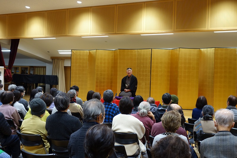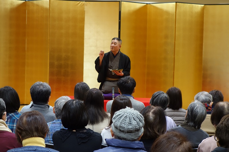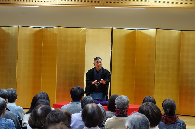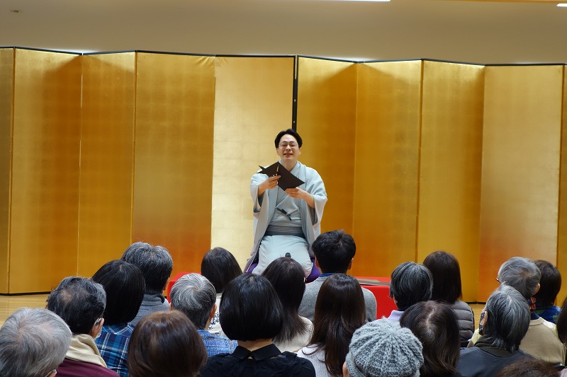 晴天に恵まれた1月24日(土)に、事前に参加申し込みのあった多くの皆様の方々の参加を得て、新春恒例の落語鑑賞会を開催しました。受付開始前から来場される方の姿も見られ、会場は開演前から期待感に包まれていました。