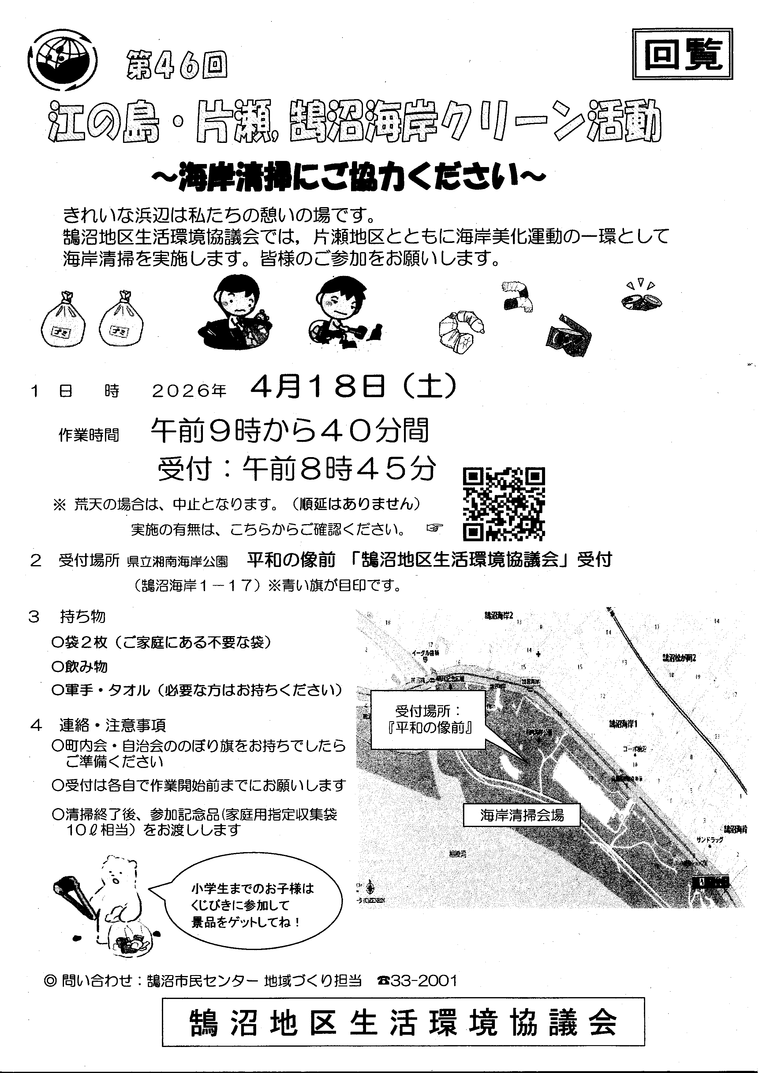 4月18日(土)朝9時から40分間ほど今年初めての海岸清掃「第46回 江の島・片瀬,鵠沼海岸クリーン活動」(主催:鵠沼地区生活環境協議会)が「鵠沼海岸」で行われます。